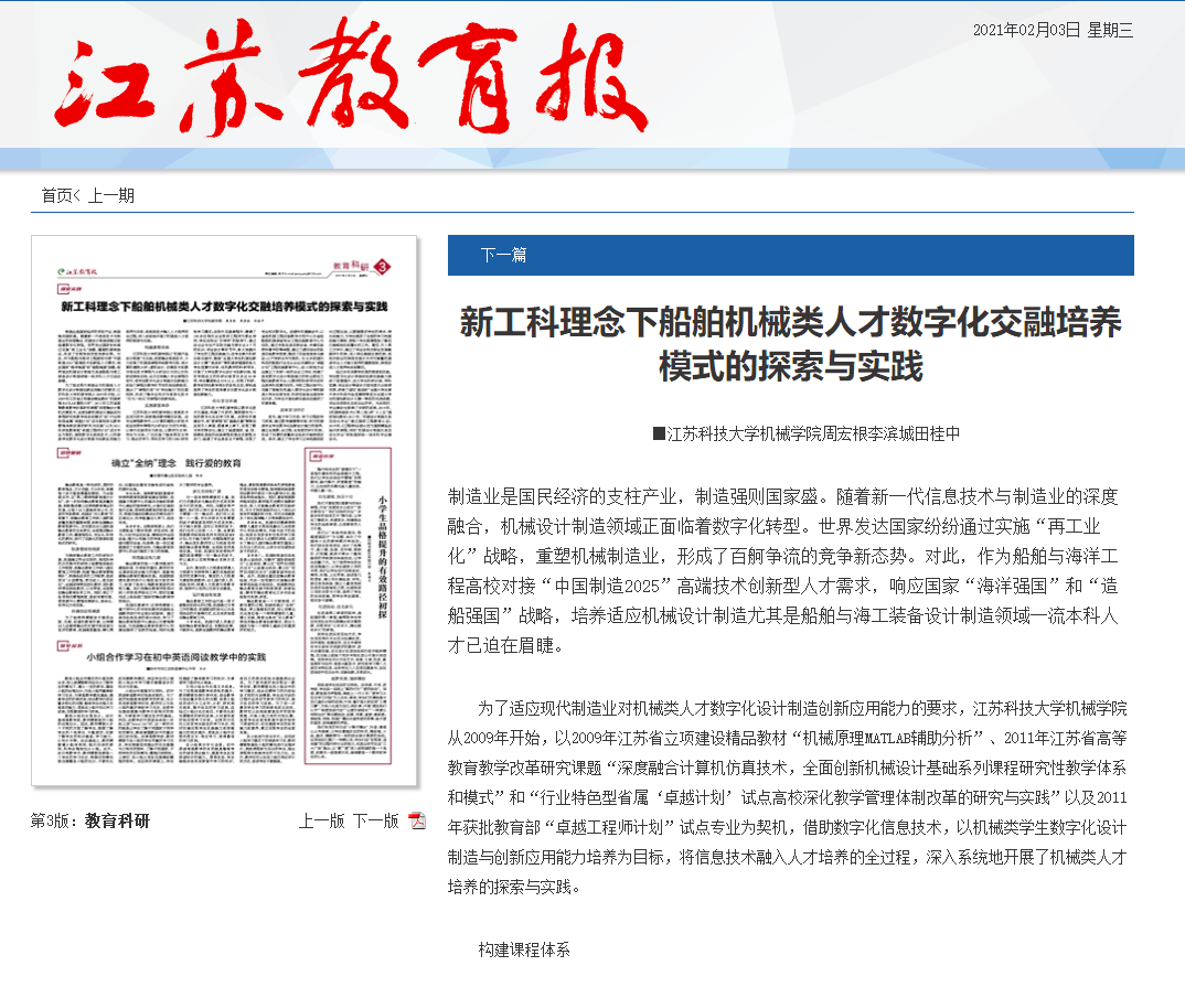为了适应现代制造业对机械类人才数字化设计制造创新应用能力的要求,新蒲京娱乐场官网3245机械学院从2009年开始,以2009年江苏省立项建设精品教材“机械原理MATLAB辅助分析”、2011年江苏省高等教育教学改革研究课题“深度融合计算机仿真技术,全面创新机械设计基础系列课程研究性教学体系和模式”和“行业特色型省属‘卓越计划’试点高校深化教学管理体制改革的研究与实践”以及2011年获批教育部“卓越工程师计划”试点专业为契机,借助数字化信息技术,以机械类学生数字化设计制造与创新应用能力培养为目标,将信息技术融入人才培养的全过程,深入系统地开展了机械类人才培养的探索与实践。