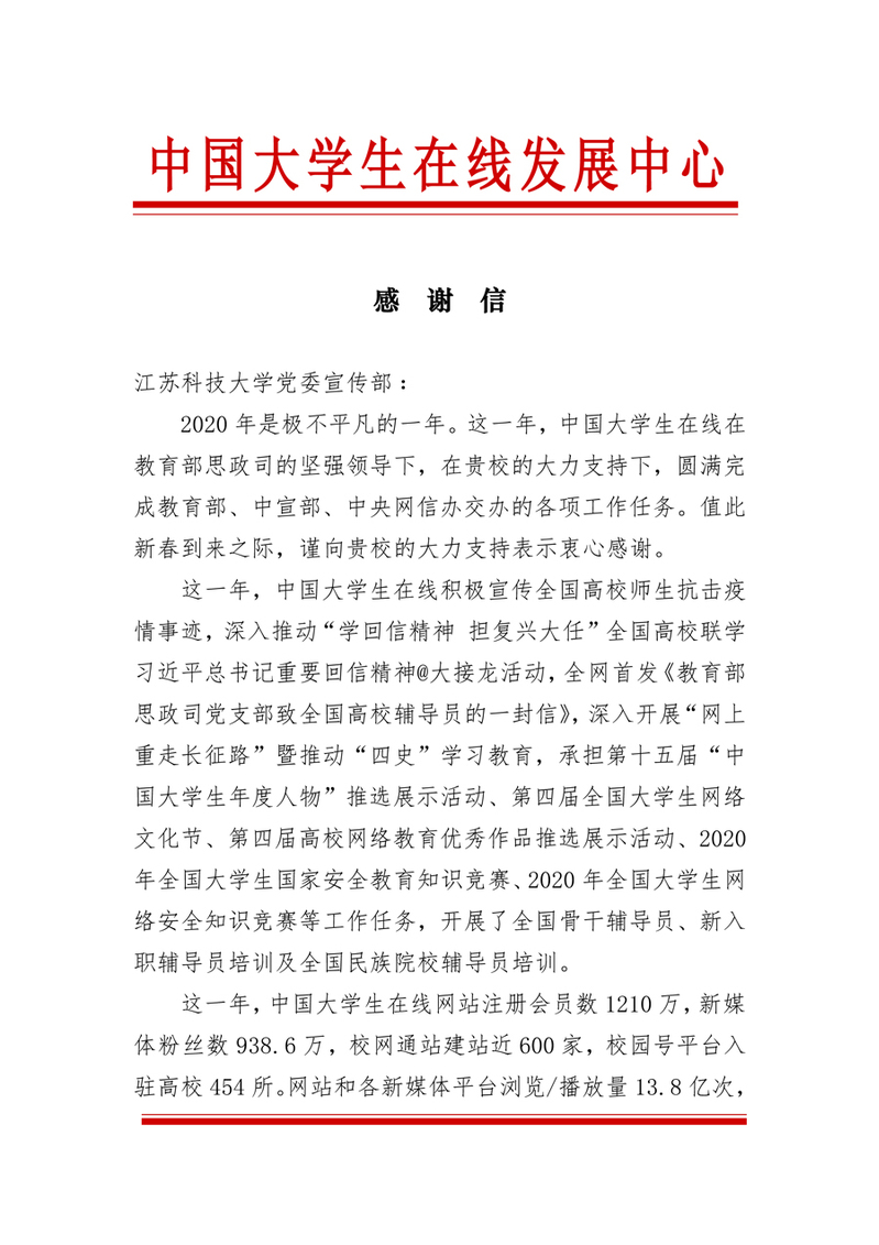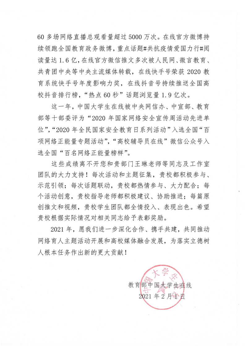 2月5日,教育部中国大学生在线向新蒲京官网宣传部发来感谢信,就新蒲京娱乐场官网3245党委宣传部的大力支持表示衷心感谢,特别是对学校积极参与中国大学生在线策划的活动和话题联动,团队师生全情投入、表现出色表示感谢,表示将进一步深化合作,携手共建,共同推动网络育人主题活动开展和高校媒体融合发展,为落实立德树人根本任务作出新的更大贡献。