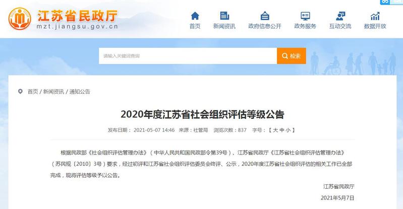 5月7日,江苏省民政厅网站发布《2020年度江苏省社会组织评估等级公告》,正式公布2020年度社会组织评估结果,新蒲京娱乐场官网3245教育发展基金会再次获评江苏省4A级社会组织。