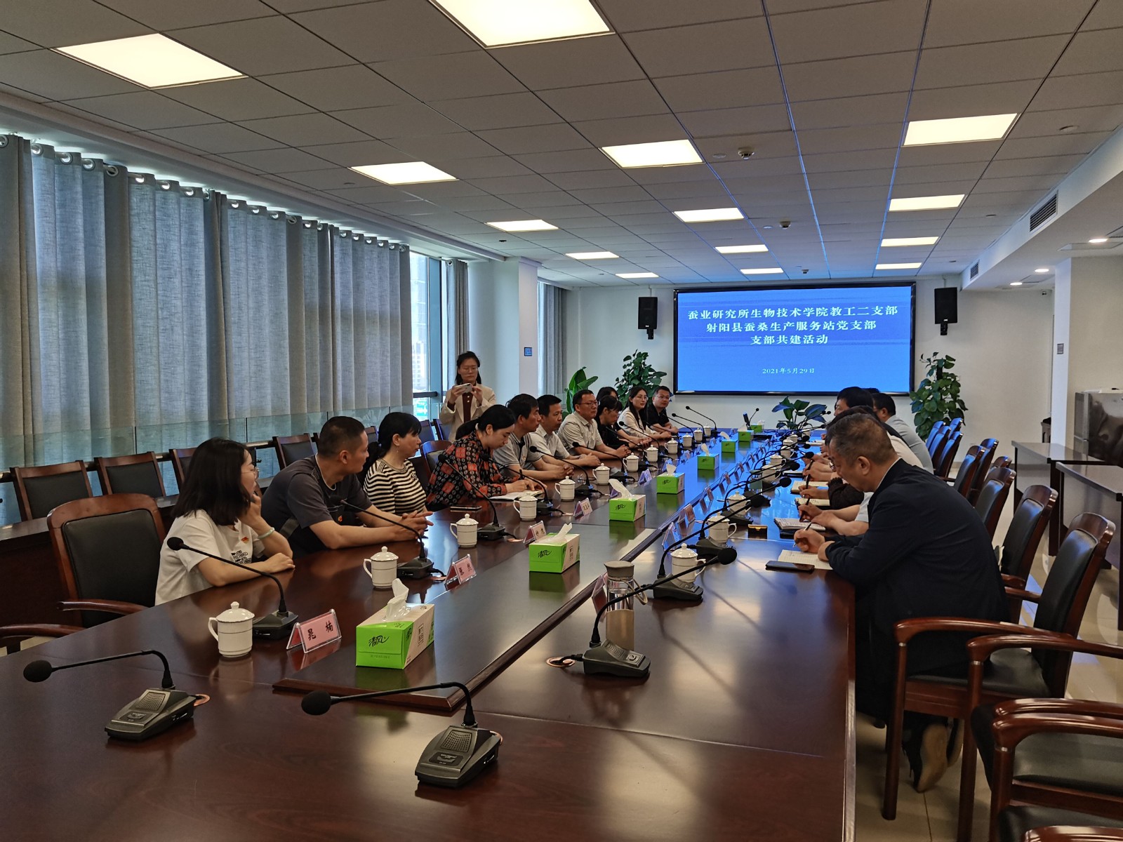 上午,教工第二党支部与射阳县蚕桑站党支部的党员同志们进行了座谈,就当前射阳县蚕桑事业的发展现状和面临的问题进行了交流。射阳县蚕桑站站长殷安亮介绍了射阳县蚕桑产业现状以及目前主要推进的重大项目。重点介绍了射阳县当地的家庭式多规模蚕桑产业模式,以及蚕桑特色小镇特庸镇的建设情况。茆迎春副站长提出了当下射阳县蚕桑产业发展遇到的问题及技术需求。教工第二党支部书记吴萍介绍了支部近三年围绕“科技创新,人才培养,产业服务,弘扬蚕桑文化”等方面开展的工作。张国政研究员对射阳县蚕桑产业的发展前景进行了展望,并针对人才培养和产业规划等方面提出了宝贵建议。