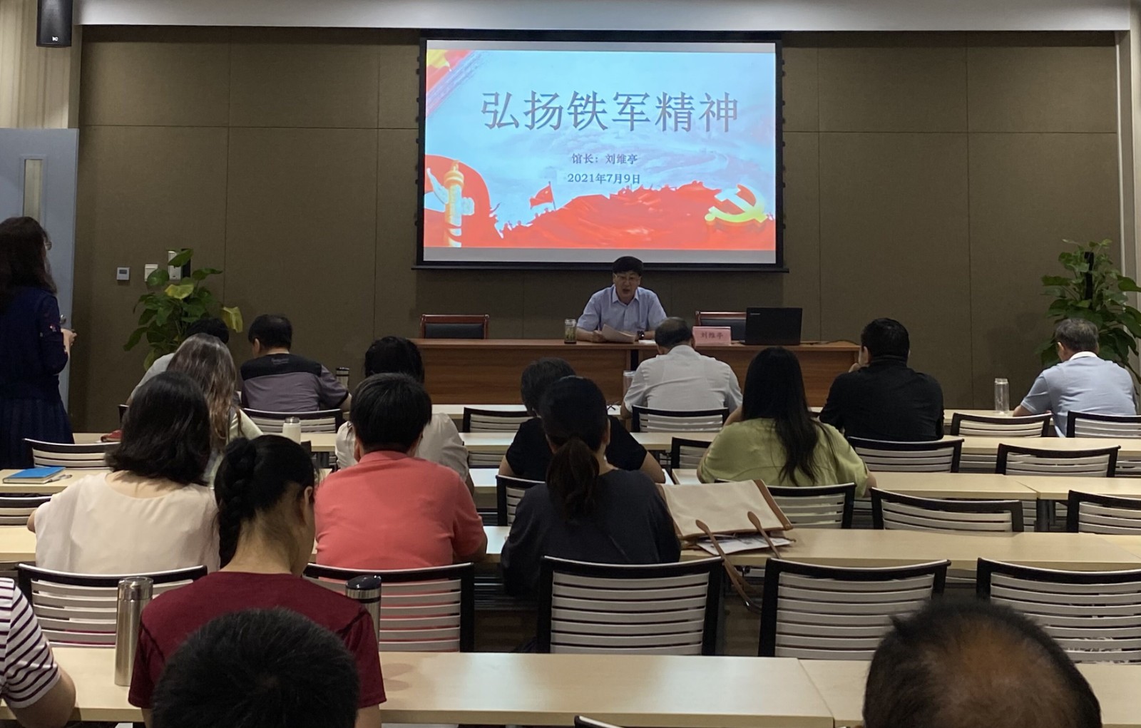 7月9日下午,图书馆召开全体馆员会议,会议分两个阶段,一是馆长刘维亭作题为“学党史·弘扬铁军精神,积极开展为读者办实事”专题党课;二是图书馆安全生产暨学期末工作会议。
