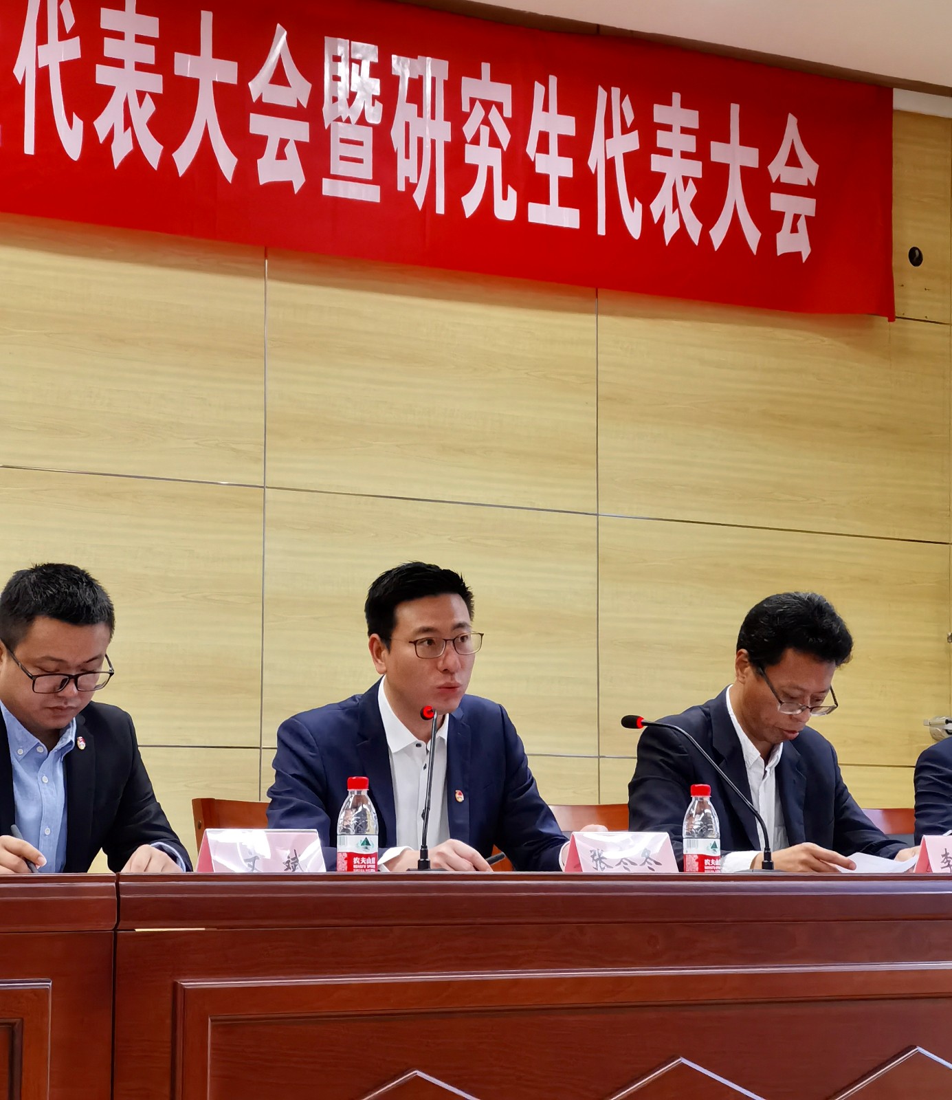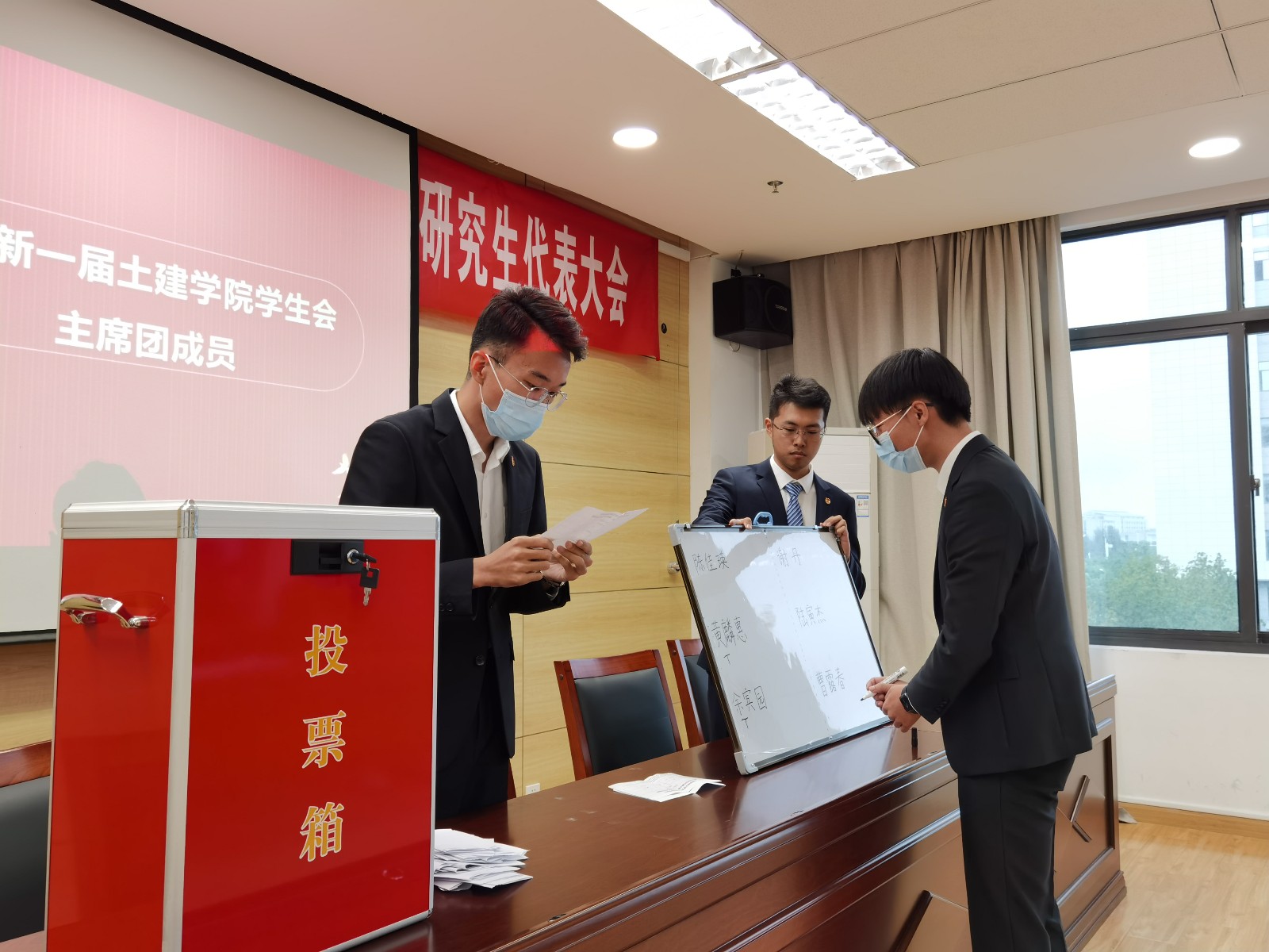 上一届学生会主席薛泽和上一届研究生会主席谢红梅分别对2020-2021学年进行工作报告,并且提请各位代表审议。接着,进行新一届学生(研究生)会主席团成员的竞选答辩,各位竞选人纷纷上台展示自己,并从自身特点、对学生会工作认知等各方面进行了简短的演讲。全体成员秉持着“公平、公正、公开”的原则,以无记名投票方式进行差额选举,根据各位代表的投票选举,并由监票人、计票人公开唱票的形式,最终成功选举出了新一届学生(研究生)会主席团成员。随后,新一届学生(研究生)会主席团当选人员集体亮相,他们共同表示将不负领导和同学的信任与期望,努力工作,力争上游。