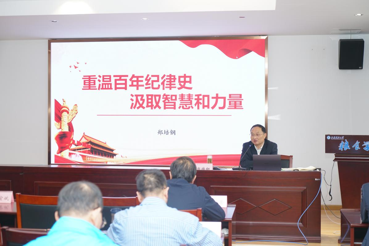 11月4日下午,粮食学院特邀校党委常委、纪委书记、派驻监察专员郑培钢来院作题为“重温百年纪律史 汲取智慧和力量”的专题党风党纪教育报告会。报告会由粮食学院党总支书记梁忠臣主持,粮食学院领导班子成员、各系部负责人、教工党员以及国家粮食和物资储备系统三省一市垂直管理局35位学员一起聆听了报告。