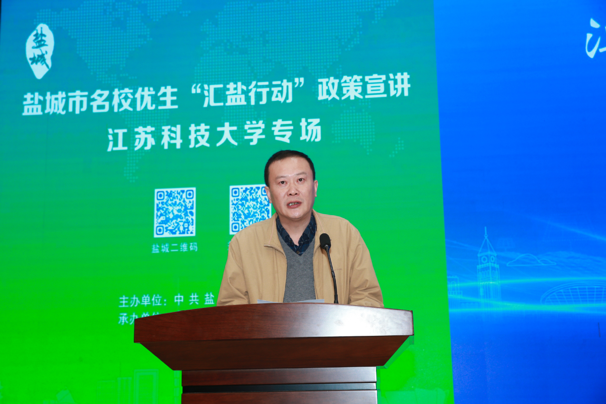 周达虎向同学们介绍盐城市及盐都区的引才政策,表达盐城市对人才的渴求以及对江科大学子的欢迎。学校毕业生代表介绍了在盐城的工作、生活和学习情况,表示要建设美好盐城,期望有更多江科大优秀学子加入盐城的经济建设。