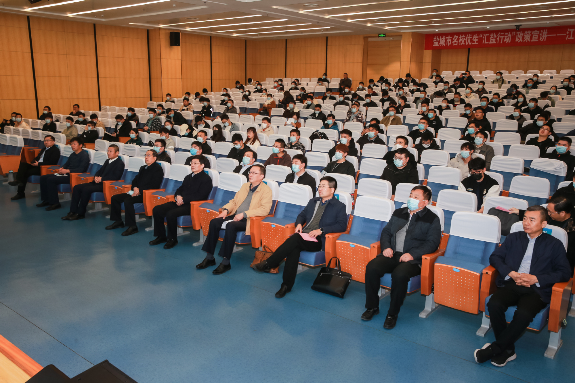 11月26号上午,盐城市名校优生“汇盐行动”政策宣讲会在新蒲京娱乐场官网3245长山校区图书馆报告厅105举行。活动由盐城市盐都区委常委、组织部长周达虎主持,盐城市政协副主席葛启发,纪委监委第二派驻纪检监察组组长吴宏庆,新蒲京官网副校长汤建、学生工作部部长蒋春雷、研究生工作部部长祁凯等出席,教职工代表及300余名毕业生参加此次宣讲会。