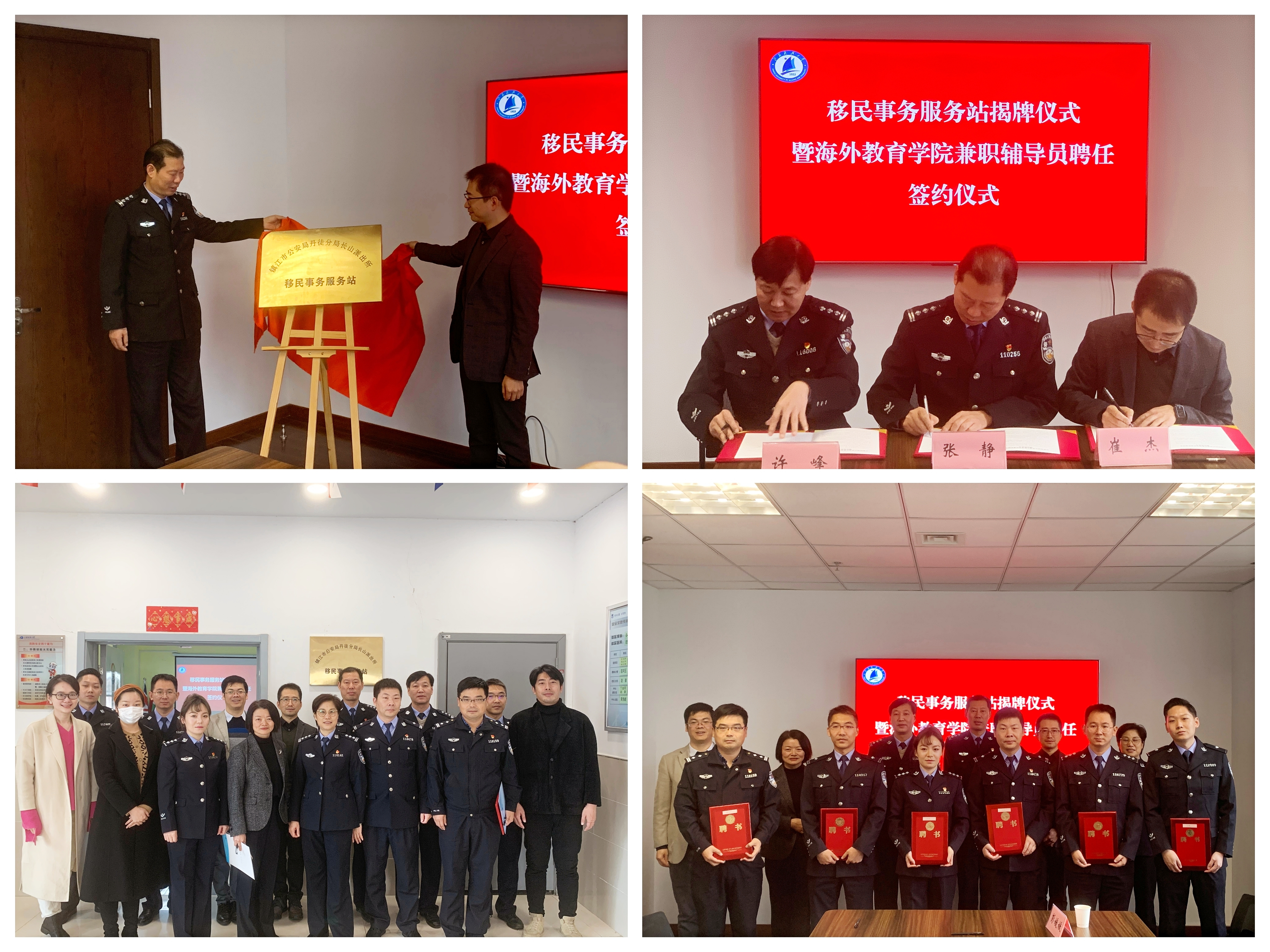 12月9日上午,镇江市首个校园移民事务服务站在新蒲京官网长山校区揭牌。移民事务服务站将由镇江市公安局出入境管理部门和新蒲京官网海外教育学院联合使用。镇江市公安局出入境张静支队长、镇江市公安局丹徒分局许峰副局长、新蒲京官网海外教育学院崔杰院长等出席揭牌仪式。