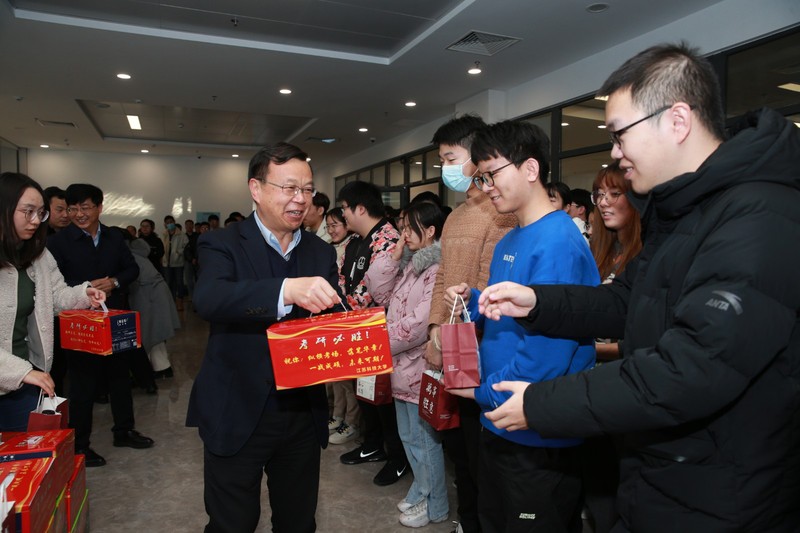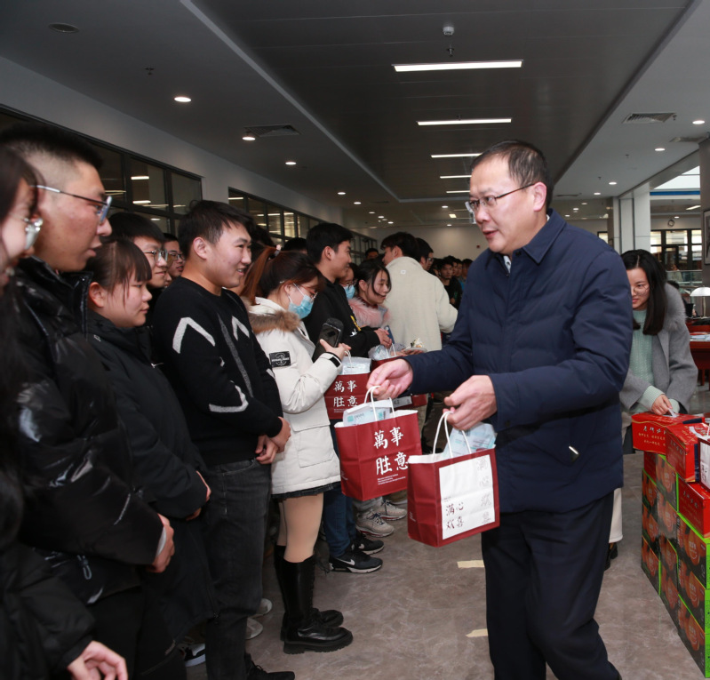 现场氛围其乐融融。学生处处长蒋春雷主持活动。大家为考研学子分发“考研福袋”,其中包含寓意“牛”气满满的牛奶、“啡”要上岸的咖啡、“橙”心如意的橙子、属你最“棒”的棒棒糖、“暖”意洋洋的暖宝宝、“罩”气蓬勃的口罩,以及全校师生代表为2021年考研学子手写的祝福卡片。一份份贴心礼物如冬日暖阳温暖考研学子心田,为他们考试冲锋助力护航,期盼他们一战成“硕”。