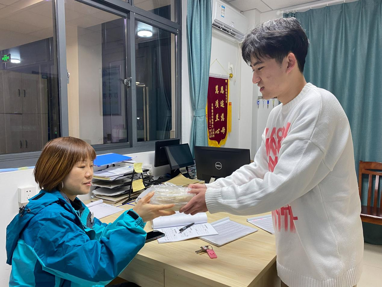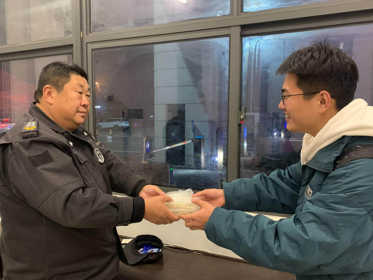 随后,同学们走进宿舍、走进值班室,为和蔼可亲的宿管阿姨、辛勤值班的保安大叔送上精心准备的“冬至暖心饺”。感恩日日夜夜守候着宿舍安全的值班老师,感恩为校园安全艰辛付出的门卫大叔。