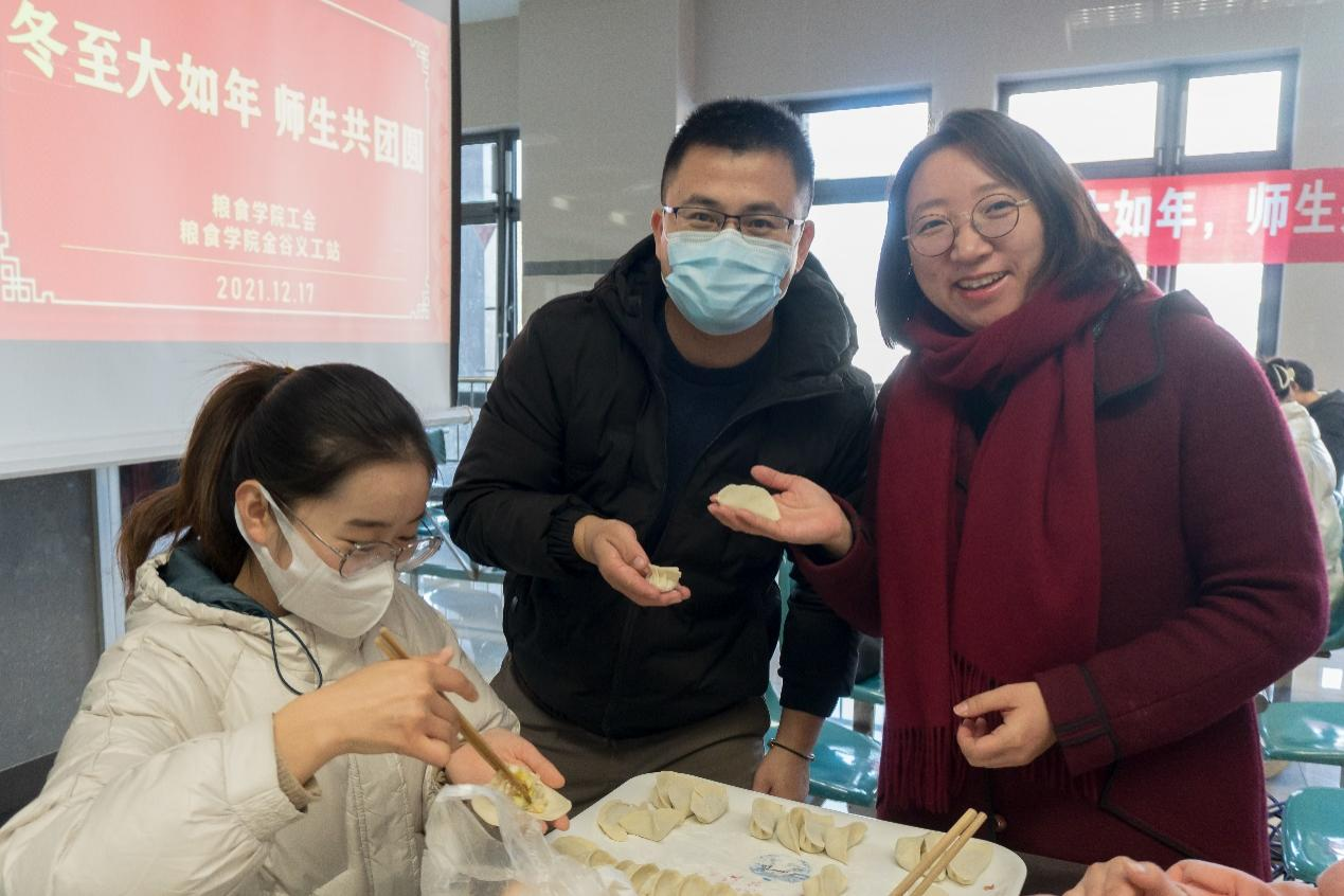 在食堂二楼,大家洗净双手,做好消毒工作,其乐融融共度冬至。粮食学院全体党政领导、各系办老师和同学们围坐一桌,大家相互学习借鉴,探讨不同饺子的包法。桌子上有白菜猪肉和芹菜牛肉两种馅料,大家自由发挥,包出具有自己家乡特色的饺子。现场一些不会包饺子的同学努力学习,引来阵阵欢笑。老师们手把手传授技巧,每个人脸上都洋溢着灿烂的笑容,现场欢声笑语不断。