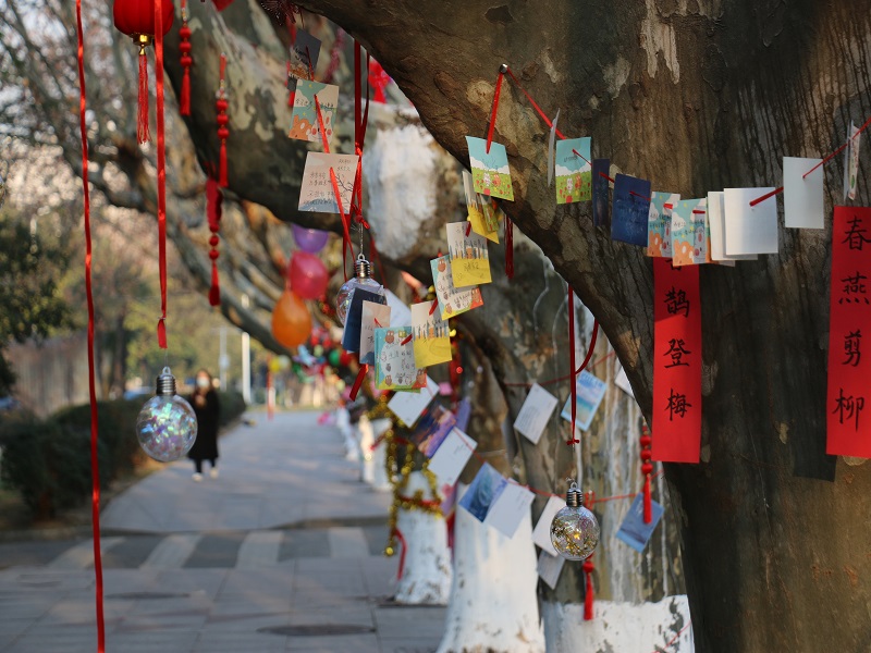 “一棵树一支部”,深蓝学院135个团支部以支部组队,每队认领勤奋路两旁的一棵树,对其进行装饰。各班同学集思广益,将自己的奇思妙想幻化作枝丫上五彩缤纷的气球和霓虹灯,年味儿应运而生。同学们积极写下了属于自己的、独一无二的新年祈福语并将其悬挂在了各班的祈福树上,小到个人、大到国家和世界,一字一句都寄予了对新年最美好的希望和憧憬。与此同时,团支书大类负责人还组织起了“跳蚤市场·元旦年会”,在相关摊位进行物品的售卖,整个校园被绚丽多彩的祈福树和摆满了琳琅满目物品的摊位装点得极具中国特色烟火气。