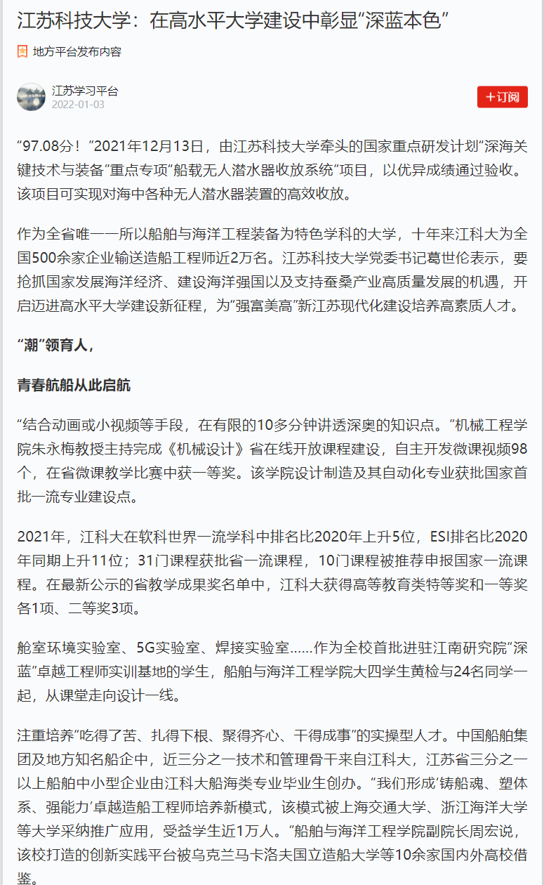 2021年,江科大在软科世界一流学科中排名比2020年上升5位,ESI排名比2020年同期上升11位;31门课程获批省一流课程,10门课程被推荐申报国家一流课程。在最新公示的省教学成果奖名单中,江科大获得高等教育类特等奖和一等奖各1项、二等奖3项。