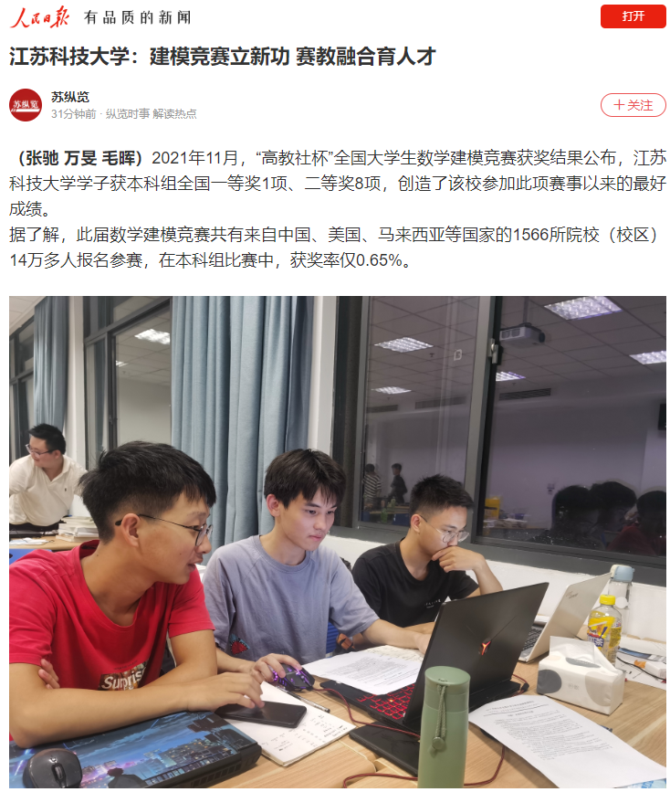据了解,此届数学建模竞赛共有来自中国、美国、马来西亚等国家的1566所院校(校区)14万多人报名参赛,在本科组比赛中,获奖率仅0.65%。