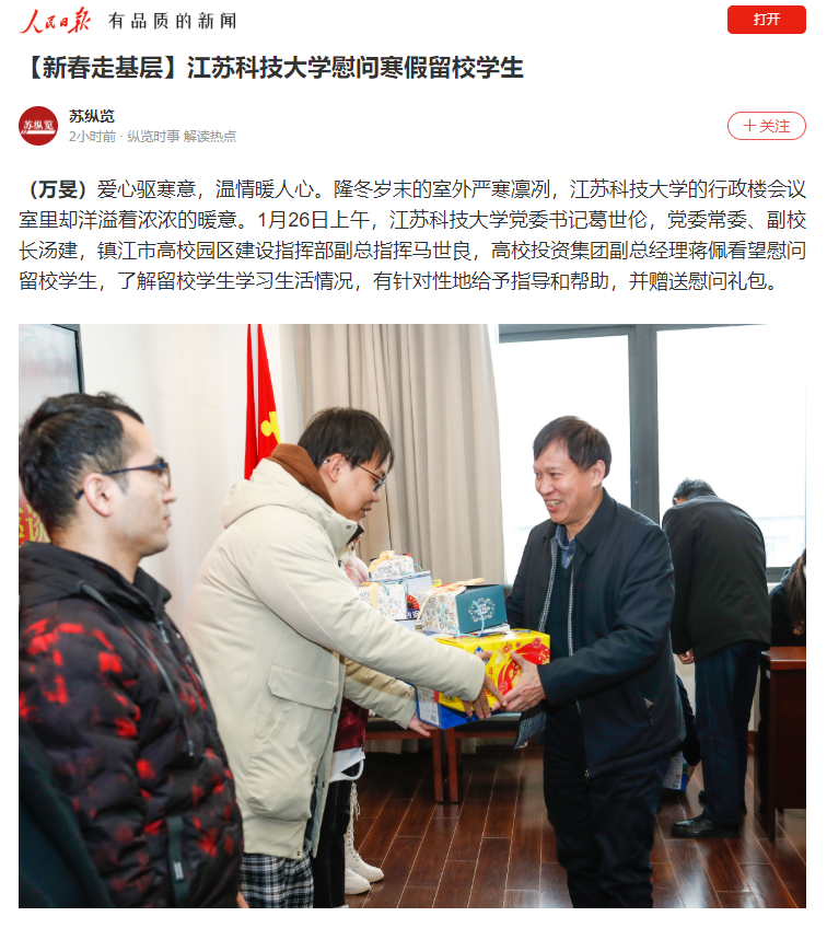 (万旻)爱心驱寒意,温情暖人心。隆冬岁末的室外严寒凛冽,新蒲京娱乐场官网3245的行政楼会议室里却洋溢着浓浓的暖意。1月26日上午,新蒲京娱乐场官网3245党委书记葛世伦,党委常委、副校长汤建,镇江市高校园区建设指挥部副总指挥马世良,高校投资集团副总经理蒋佩看望慰问留校学生,了解留校学生学习生活情况,有针对性地给予指导和帮助,并赠送慰问礼包。