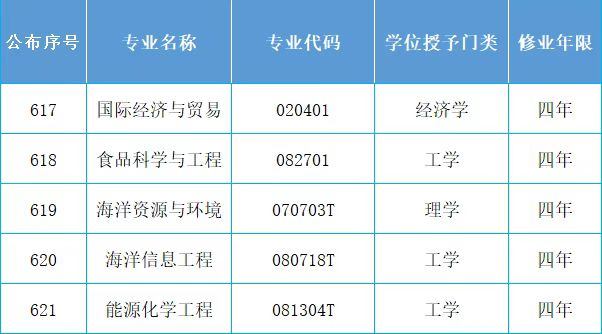 近日,教育部公布了2021年度普通高等学校本科专业备案和审批结果,新蒲京官网申报的国际经济与贸易、食品科学与工程、海洋资源与环境、海洋信息工程、能源化学工程等5个本科专业全部获批。至此,新蒲京官网本科专业总数达71个,覆盖工学、管理学、理学等8个学科门类。