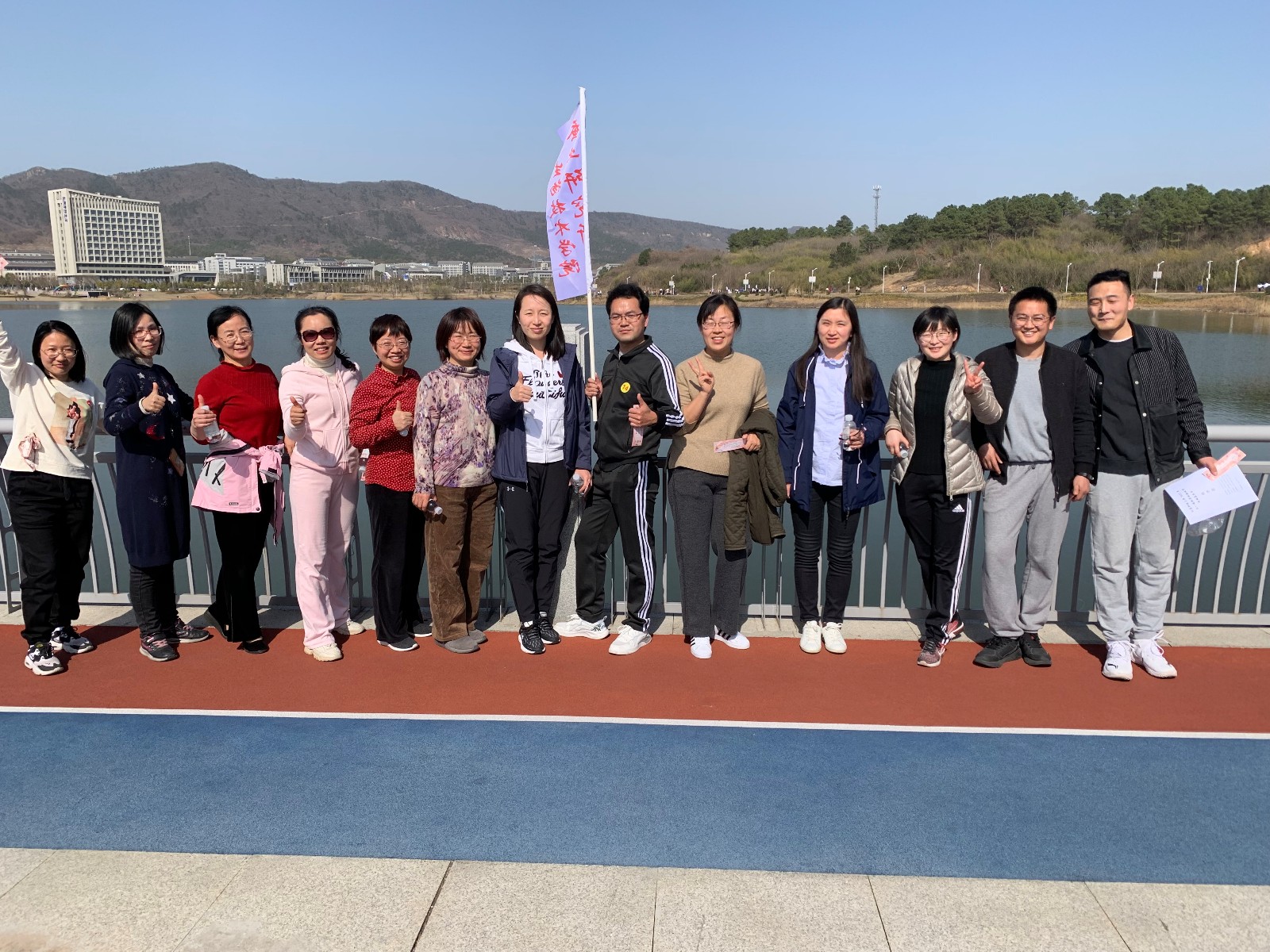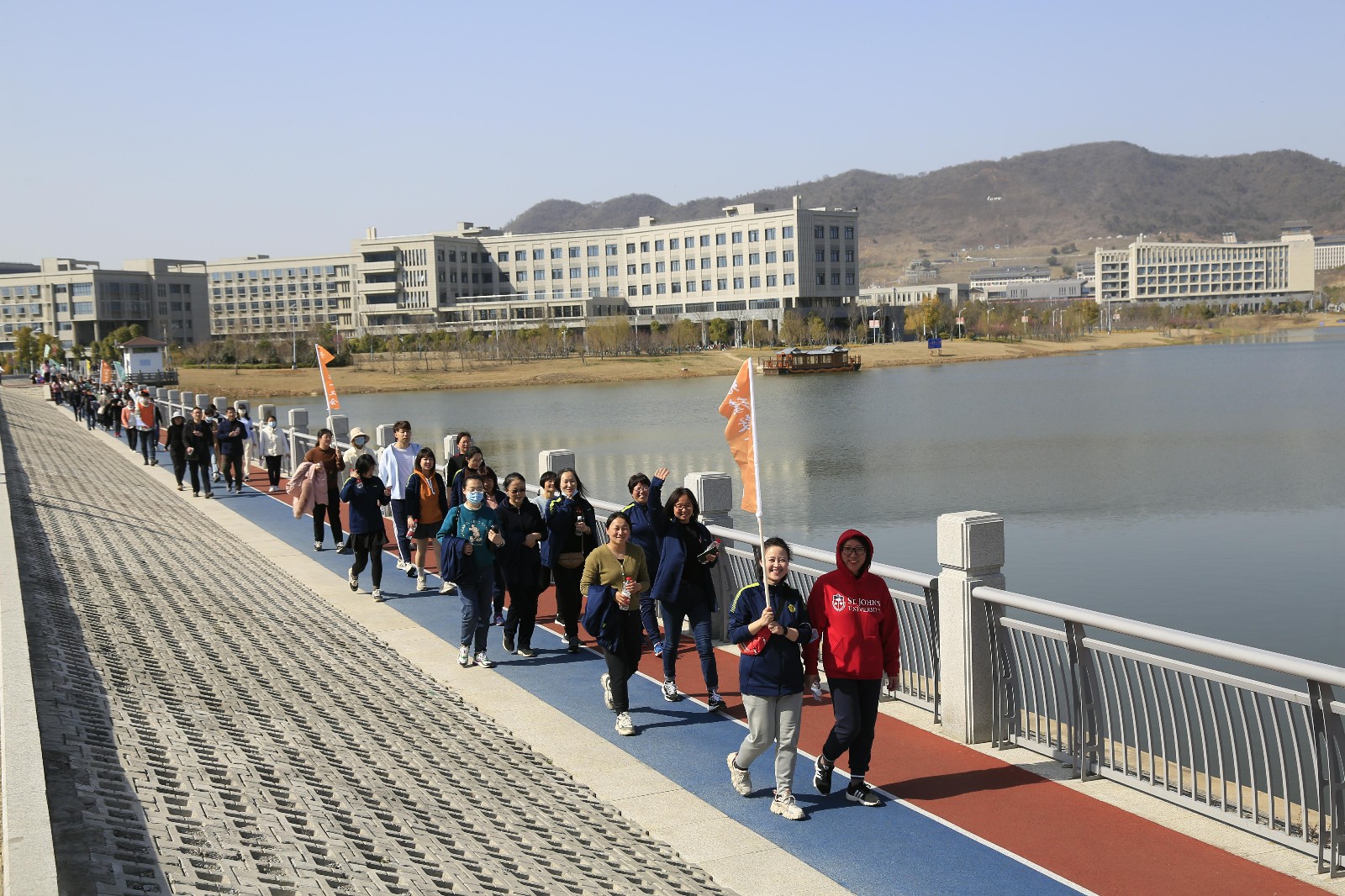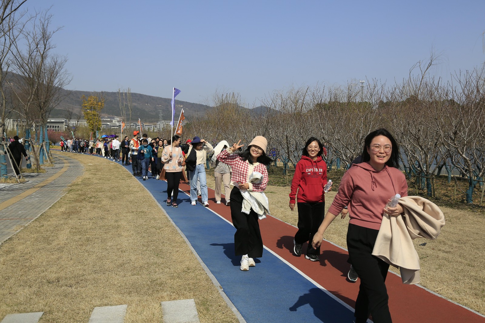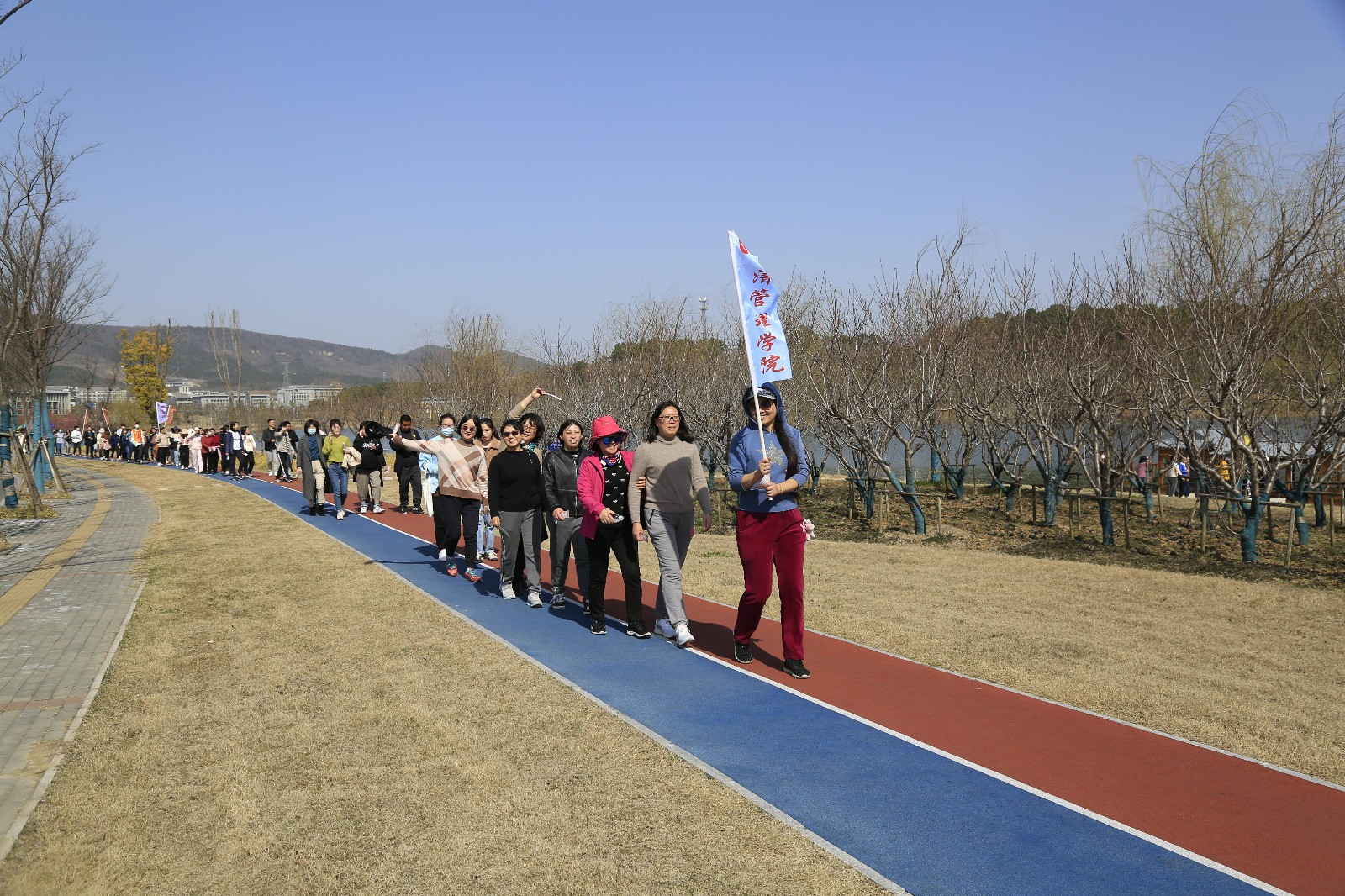 随着周南平校长一声令下,各学院各部门代表队手举飘扬的队旗步履矫健地踏上海韵湖畔的绿道,感受春日明媚的阳光,欣赏沿途赏心悦目的美景。春风如贵客,一到便繁华。伴随着美丽的校景,踏走在舒适的步道上,大家意气风发,身心舒畅,沿途纷纷合影留念,留下美好的瞬间。