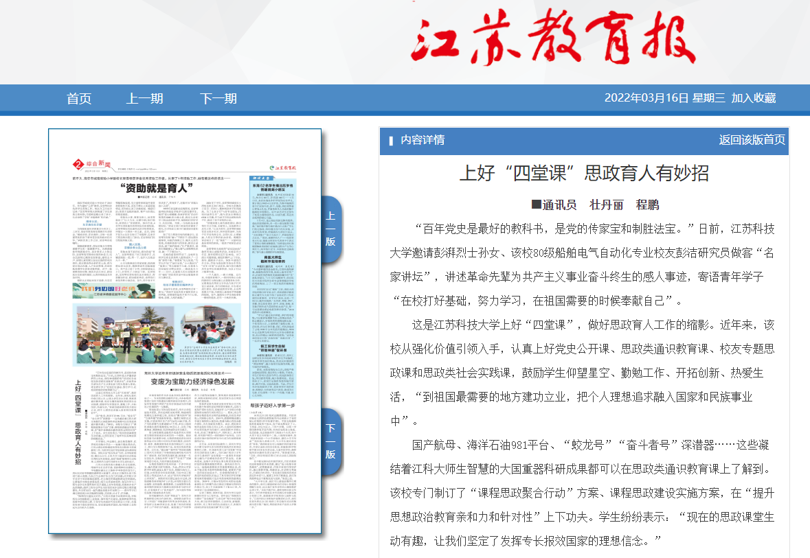 “精神的力量是无穷的。”江科大党委书记葛世伦说,学校将充分挖掘船舶工业发展、海军现代化建设、蚕桑种植等特色资源中的思政元素,引导学生找准时代坐标和奋斗目标,在鉴往知来中强化使命担当,坚定建设海洋强国、振兴船舶工业的远大志向和人生选择。