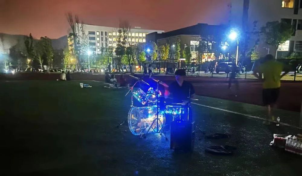 一场精彩的架子鼓solo燃爆全场,紧接着一首《那些花儿》带同学们领略音乐之美。皓月当空,草地与音乐相伴,绿茵场少了奔跑的身影多了席地而坐的同学们,大家挥舞灯光,身体随歌声摇摆。
