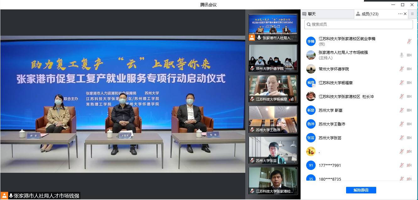4月29日下午,张家港市促复工复产就业服务专项行动启动仪式在云端开启,张家港市副市长万资平,市人社局局长张毅出席会议,市人力资源管理服务中心主任盛宇红主持会议。校区及苏理工党委常务副书记杨福章在会上做学校及毕业生推介主题发言,张家港市200余家企业代表参加会议。