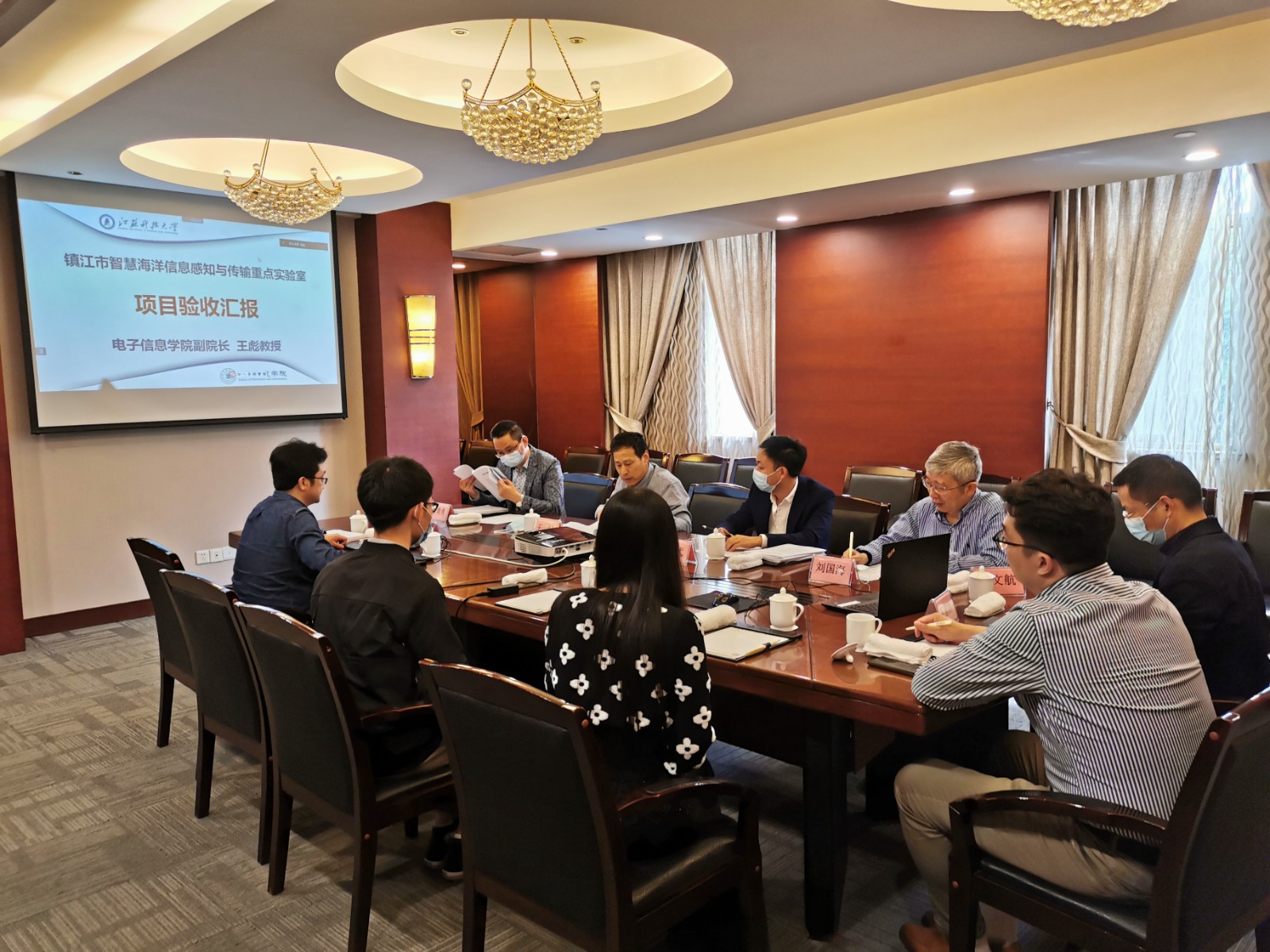 5月7日上午,镇江市科技局组织相关专家在观海楼第一会议室举行新蒲京娱乐场官网3245海洋学院“镇江市智慧海洋信息感知与传输重点实验室”验收会,按照疫情防控要求,会议采用线上和线下相结合的方式进行。项目验收委员会由中国科学院声学研究所、南京航空航天大学、河海大学、江苏大学、镇江公信会计事务所的5位专家组成,现场参会的江苏大学刘国海教授担任验收委员会主任。镇江市科技局王强处长、马弋副处长,学校科技处周宏根处长、黎文航副处长,海洋学院王彪副院长等出席验收会议。