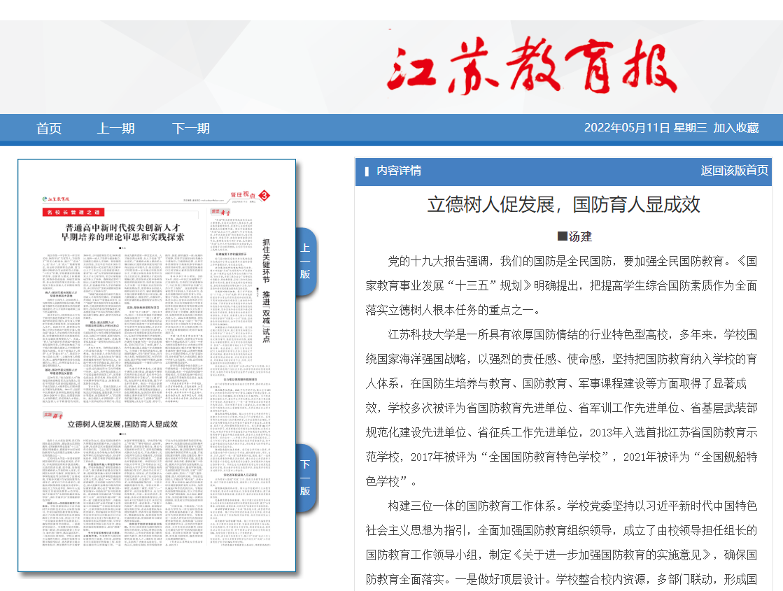 新蒲京娱乐场官网3245是一所具有浓厚国防情结的行业特色型高校,多年来,学校围绕国家海洋强国战略,以强烈的责任感、使命感,坚持把国防教育纳入学校的育人体系,在国防生培养与教育、国防教育、军事课程建设等方面取得了显著成效,学校多次被评为省国防教育先进单位、省军训工作先进单位、省基层武装部规范化建设先进单位、省征兵工作先进单位,2013年入选首批江苏省国防教育示范学校,2017年被评为“全国国防教育特色学校”,2021年被评为“全国舰船特色学校”。