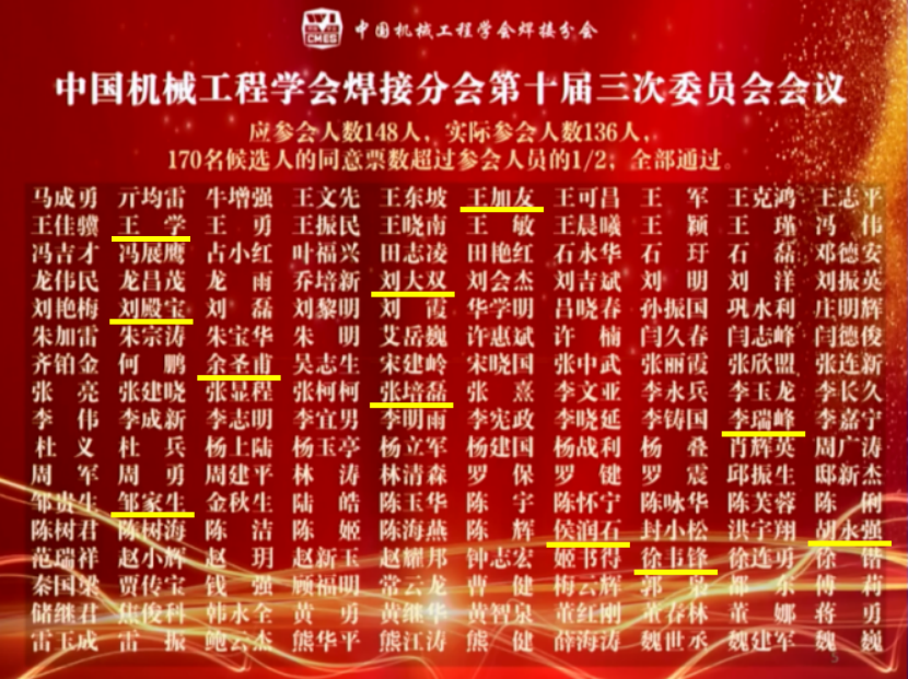 5月14日,中国机械工程学会焊接分会第十届委员会换届工作会议以线上线下相结合的方式召开,来自全国大学、科研院所、龙头骨干企业、地方学会、国家级重点实验室、国家工程研究中心等机构共计192名代表参加了会议。按照换届会议议程,选举产生了由170名委员组成的焊接分会第十一届委员会,由55名常务委员组成的焊接分会第十一届委员会常务委员会。