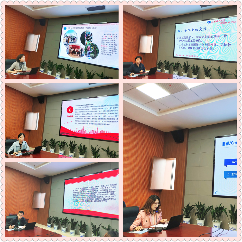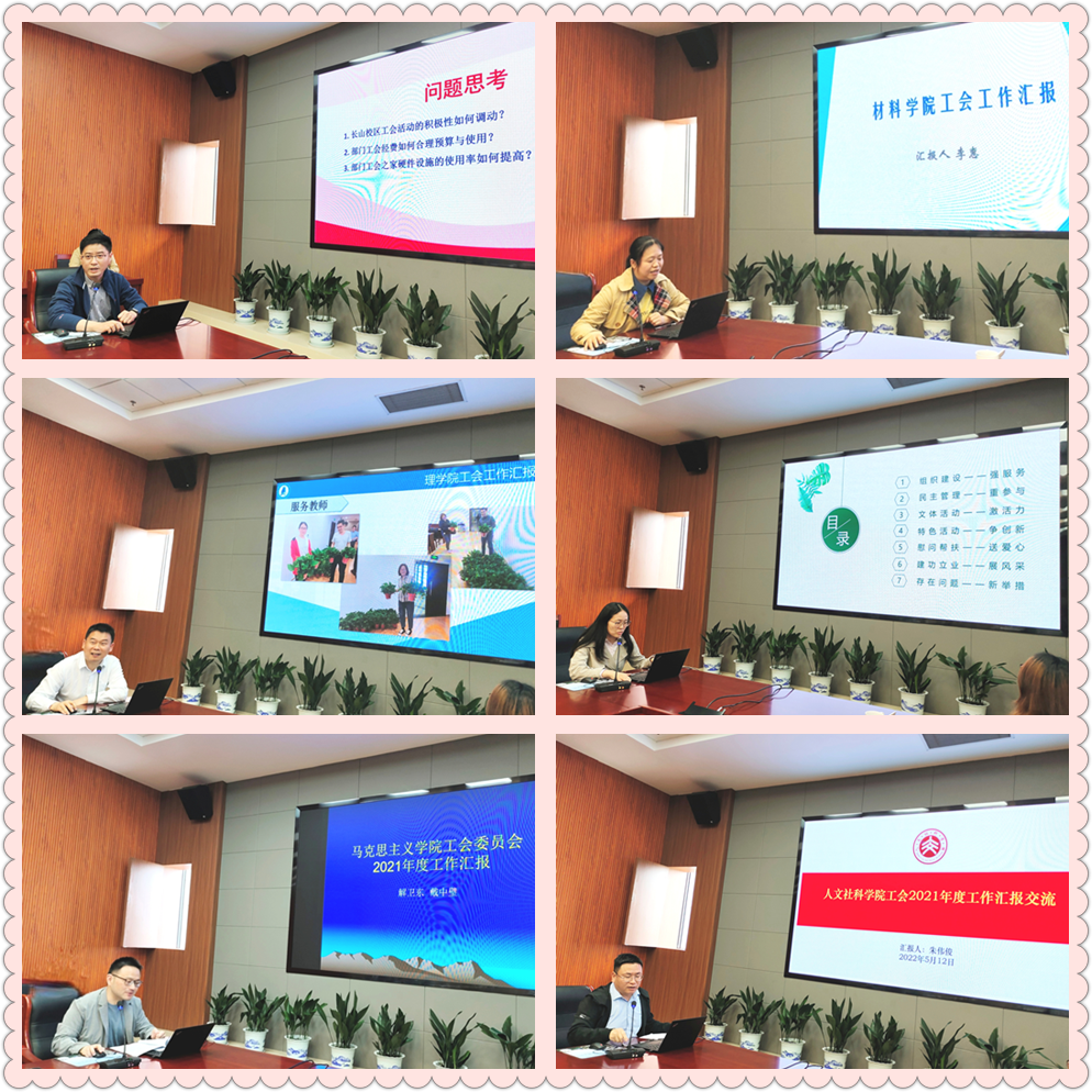 校工会常务副主席郭永强作了开场讲话,他表示,本次活动旨在加强新蒲京官网工会干部交流工作、总结经验,提高基层工会的工作质量和水平,进一步推动新蒲京官网二级工会工作有新作为新发展。随后各位工会主席图文并茂地汇报了2021年度二级教代会、工会小家建设、服务教师、文体活动、疫情防控形势下的工会作为等方面的工会工作。