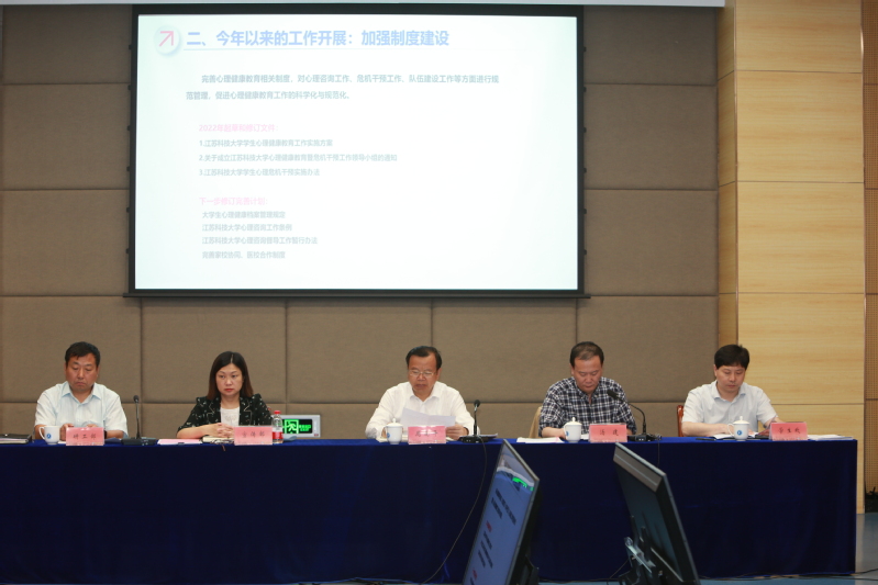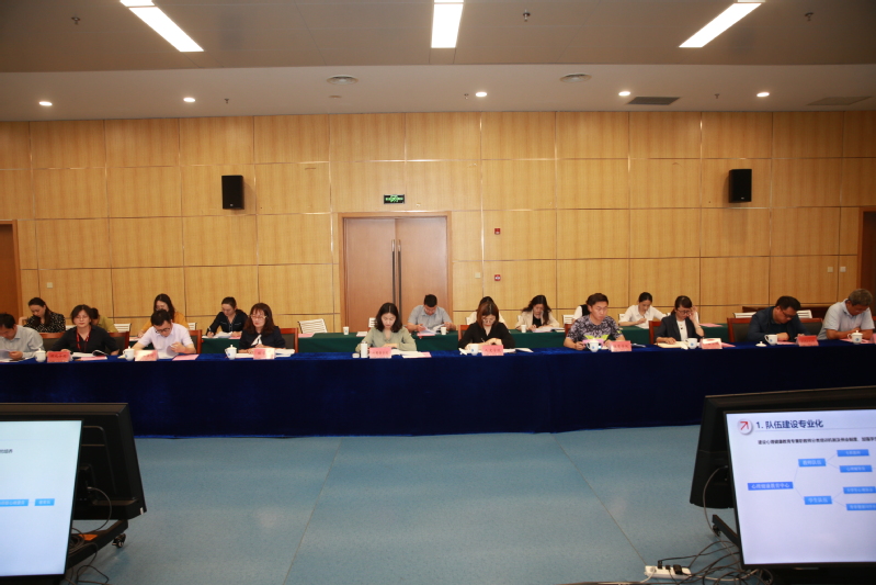 心理健康教育中心主任于立东作题为《凝练主题 优化机制 突出特色 助力成长》的心理健康教育工作汇报,汇报分三个层面:一是心理健康教育中心的基本情况,包括心理专兼职人员队伍情况、前期心理课程教学、咨询服务、实践活动、预防干预、朋辈心理健康教育队伍建设的做法和取得的有关成效,提出心理健康教育中心的愿景、使命、职责和工作目标;二是2022年心理健康教育中心的新做法,在切实加强制度建设、建立网格化工作机制、拓展日常咨询服务的基础上,构建队伍建设专业化、课程教学系统化、实践活动特色化、咨询服务多样化、预防干预规范化、平台保障标准化“六位一体”的积极心理育人体系;三是心理健康教育工作存在的困难及工作建议,从机制建设、队伍培养、学生参与、场地设施条件建设等方面指出了工作中的困难,提出了针对性的建议。