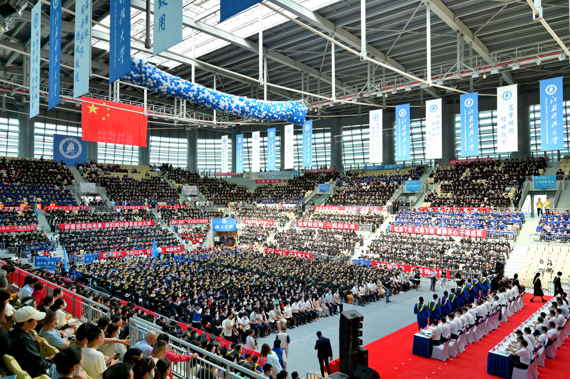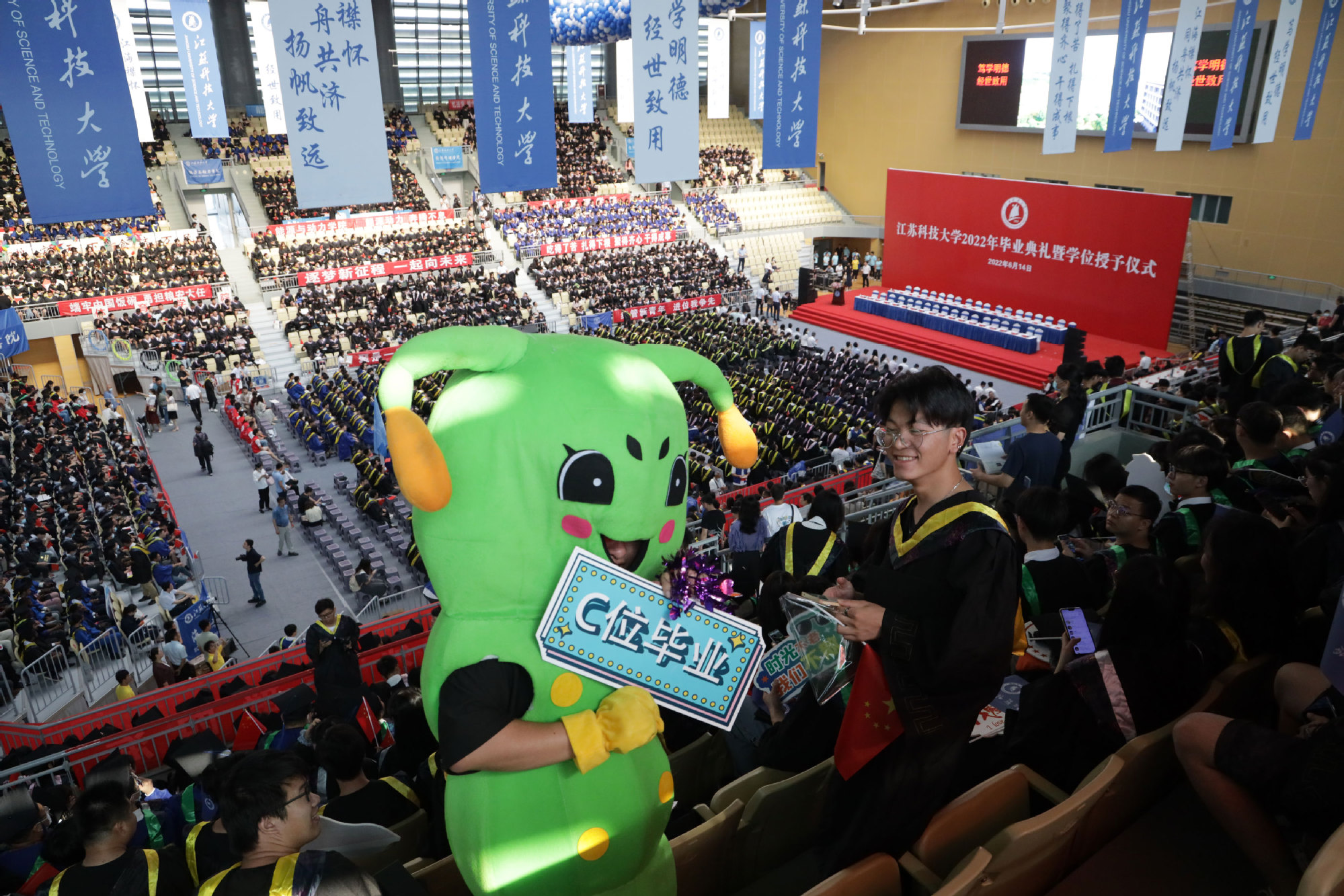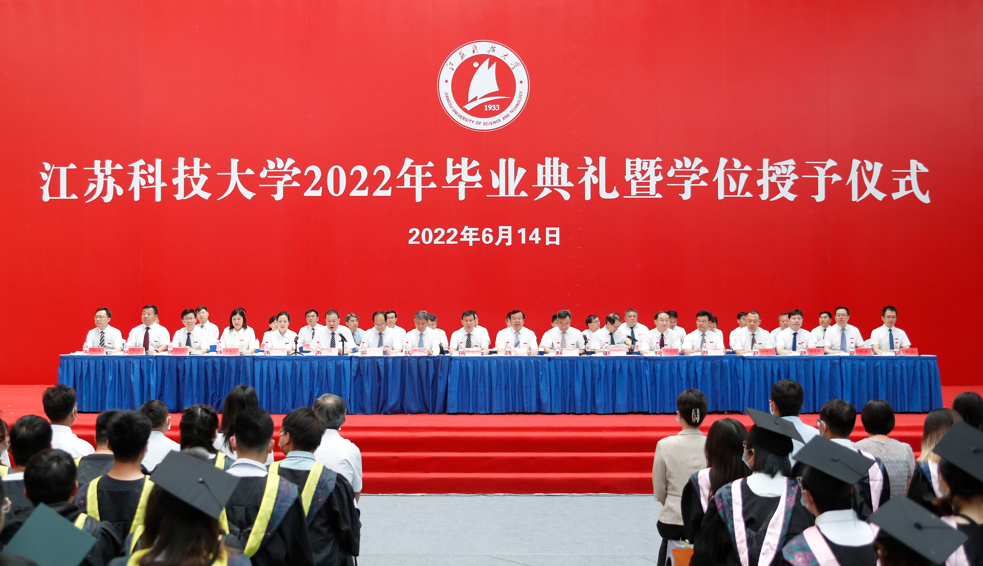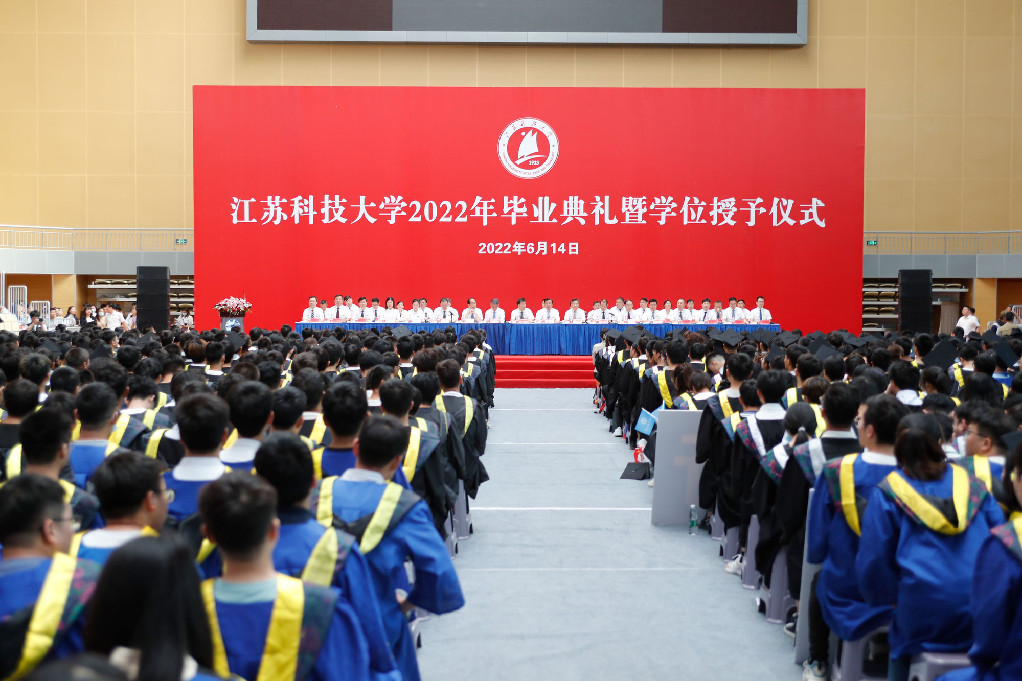 毕业典礼主会场设镇江大学城共享体育馆,张家港校区设置视频分会场。学校在官方微信视频号、B站、抖音、微博等平台开设直播,和同学们在线实时分享现场的喜悦与毕业收获。校党委书记葛世伦,校长周南平,新蒲京官网1990届校友、扬州中远海运重工有限公司总经理翟亚军,校领导景旭文、许俊华、王加友、郑培钢、任南,校党委常委李恒川、周春燕、刘新波,新蒲京娱乐场官网3245学位委员会各位导师、2022届毕业生、全体辅导员和班主任,导师和教职工代表,家长代表、校友代表、用人单位代表,热情相聚与2022届毕业生深情话别。校党委常委、副校长俞孟蕻在张家港校区分会场出席典礼,张家港校区相关部门、部分教师、家长代表、毕业生465人参加了现场典礼,因疫情原因不能参加典礼现场的毕业生及家长通过线上的方式收看了毕业典礼直播,同步感受毕业典礼“仪式感”。