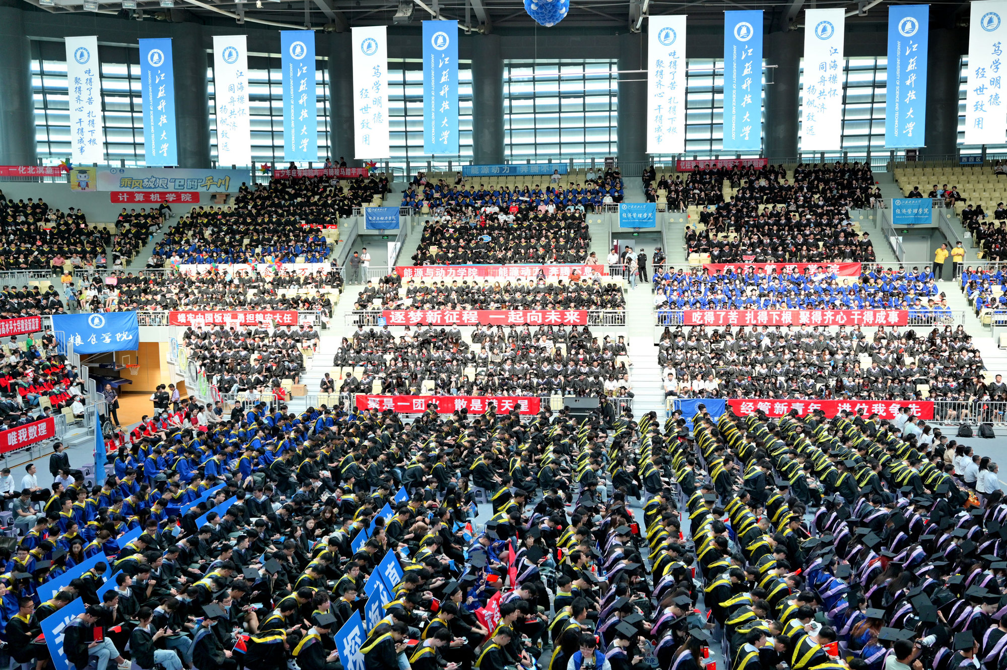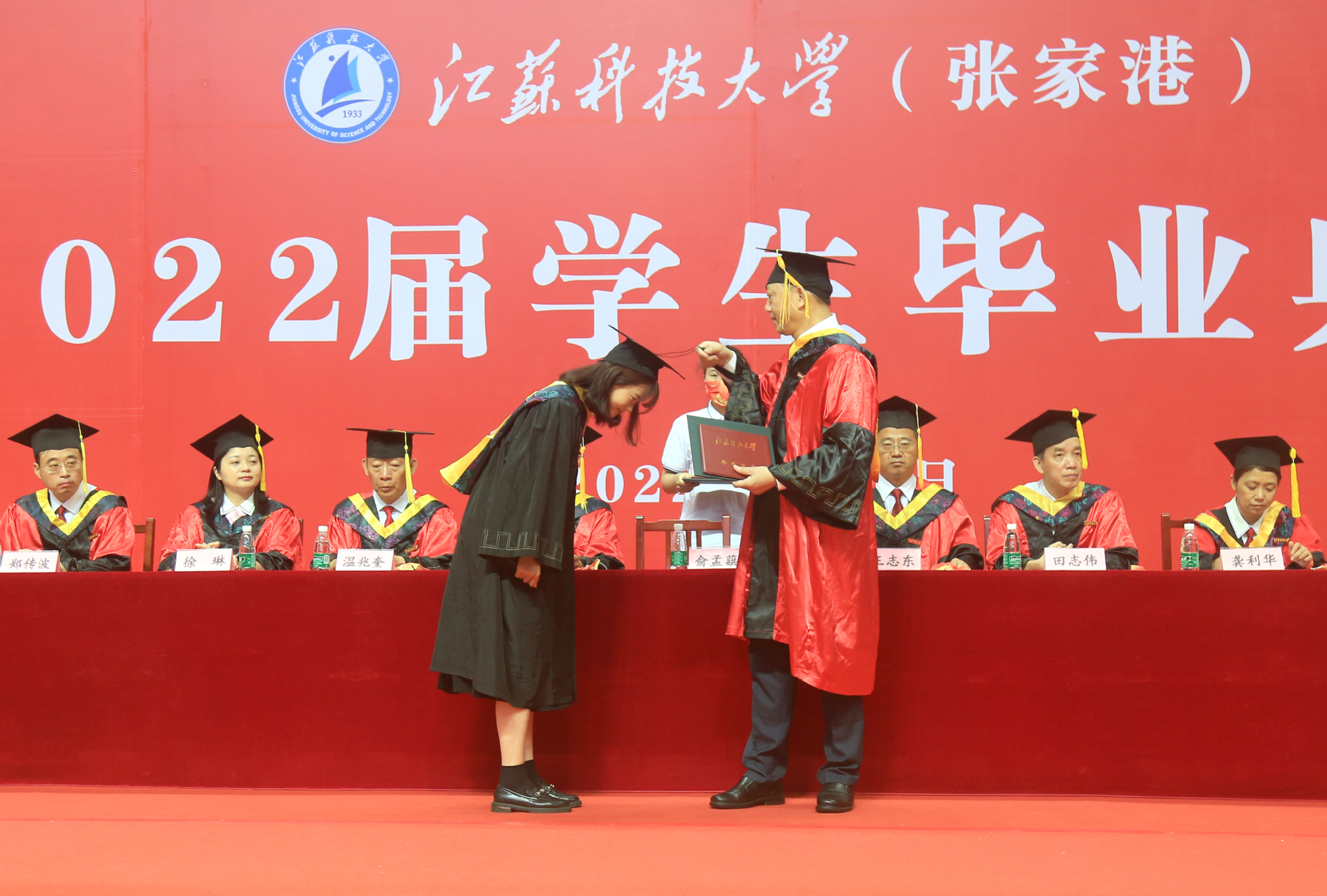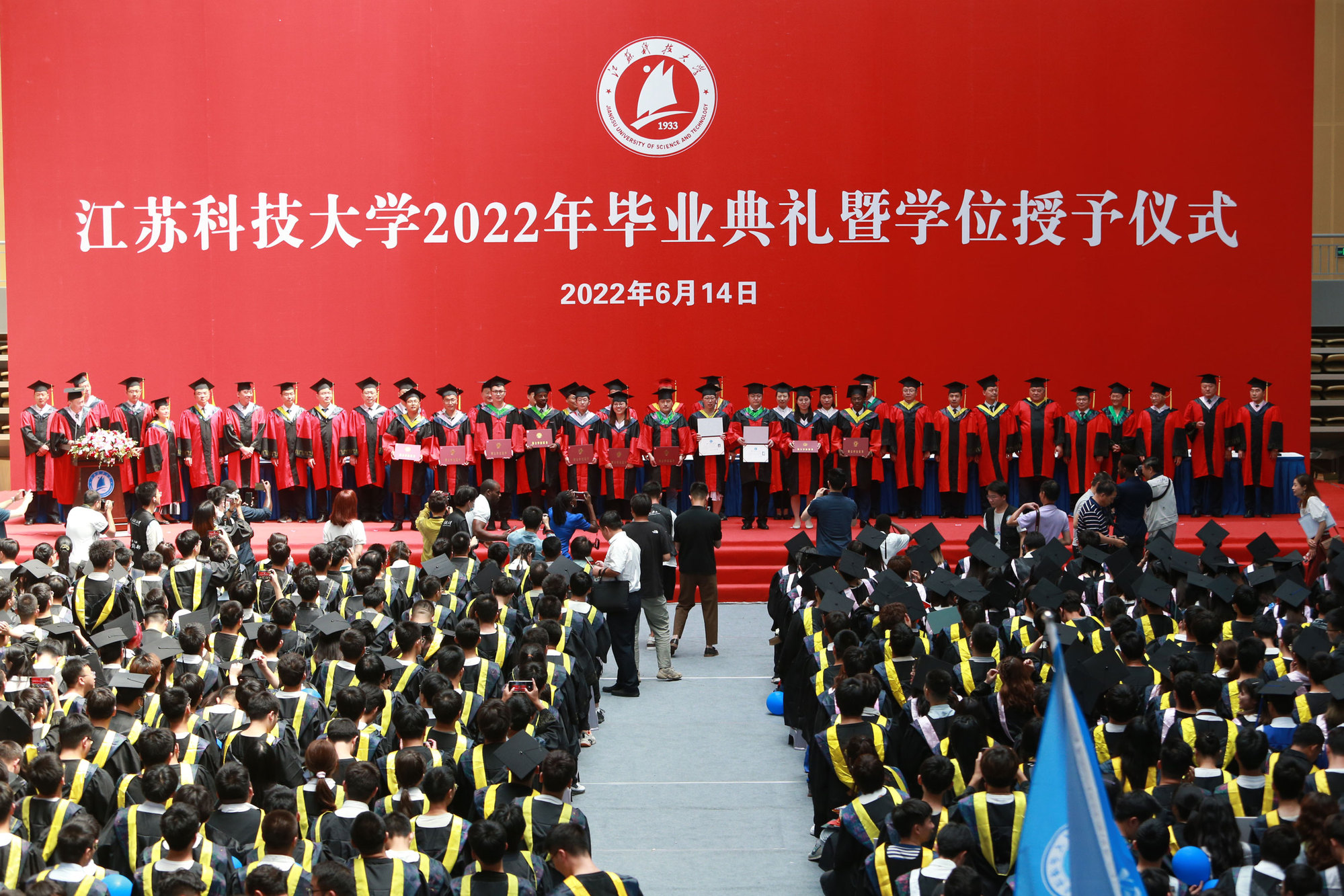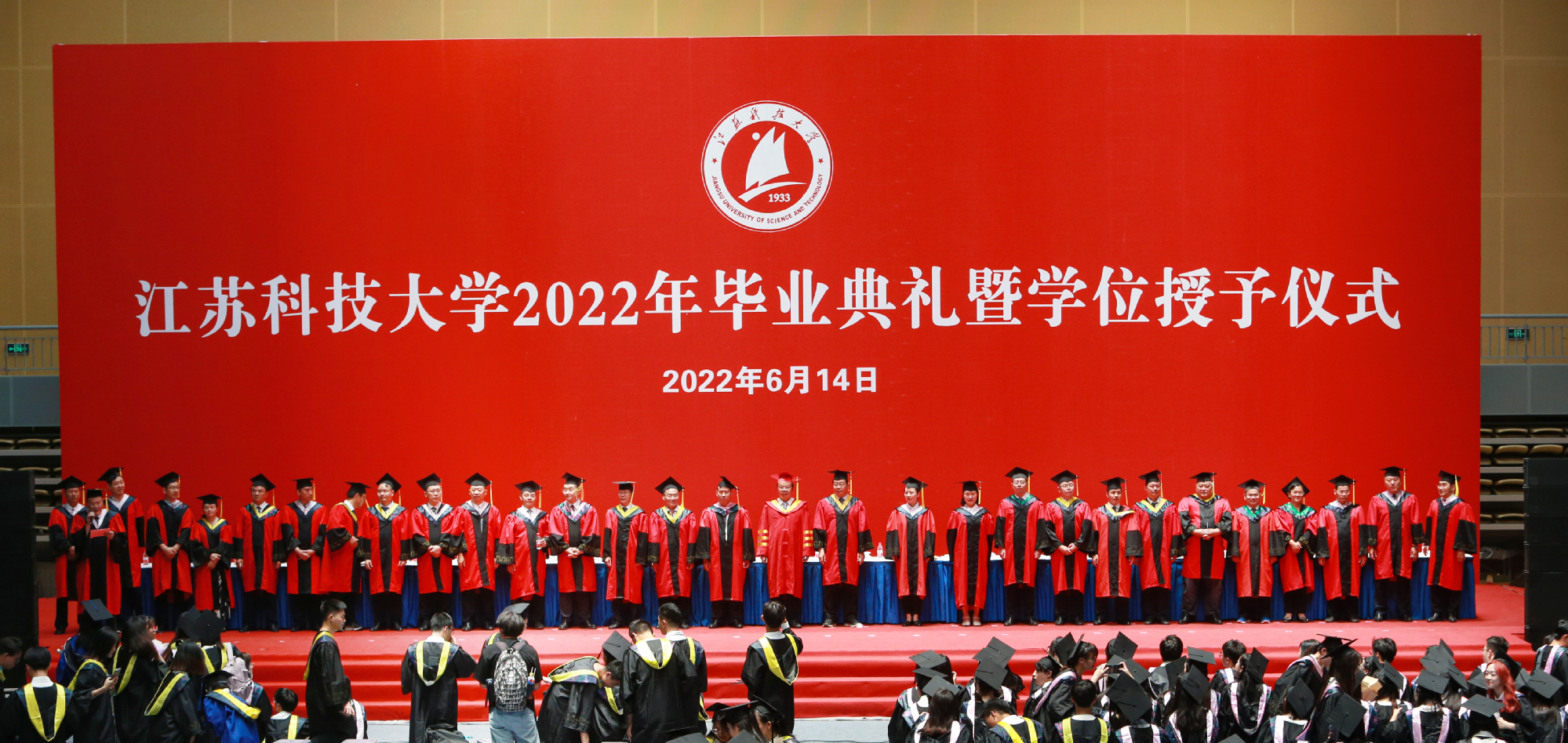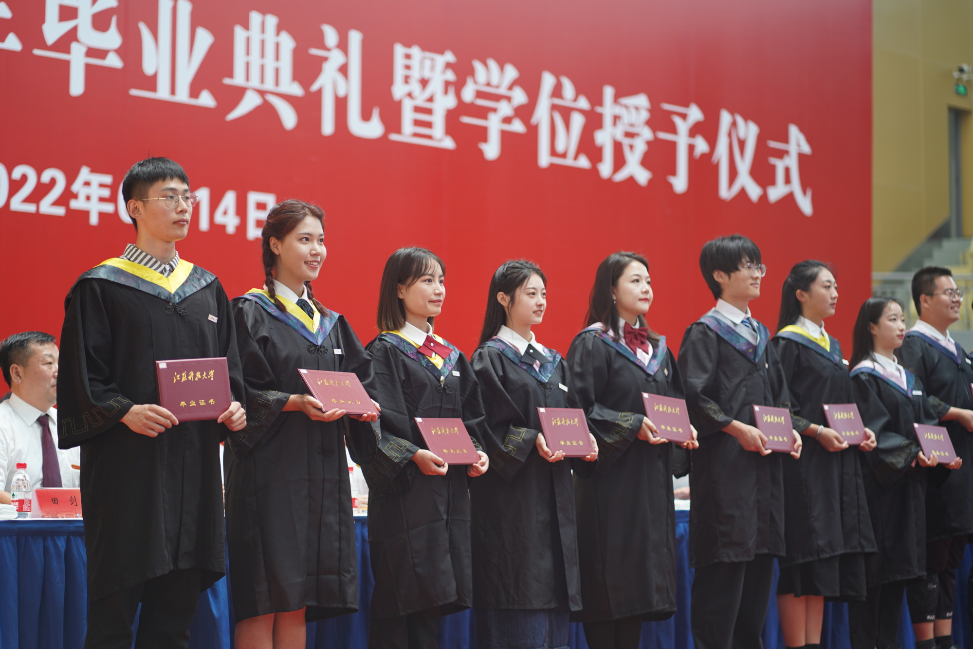 毕业典礼主会场设镇江大学城共享体育馆,张家港校区设置视频分会场。学校在官方微信视频号、B站、抖音、微博等平台开设直播,和同学们在线实时分享现场的喜悦与毕业收获。校党委书记葛世伦,校长周南平,新蒲京官网1990届校友、扬州中远海运重工有限公司总经理翟亚军,校领导景旭文、许俊华、王加友、郑培钢、任南,校党委常委李恒川、周春燕、刘新波,新蒲京娱乐场官网3245学位委员会各位导师、2022届毕业生、全体辅导员和班主任,导师和教职工代表,家长代表、校友代表、用人单位代表,热情相聚与2022届毕业生深情话别。校党委常委、副校长俞孟蕻在张家港校区分会场出席典礼,张家港校区相关部门、部分教师、家长代表、毕业生465人参加了现场典礼,因疫情原因不能参加典礼现场的毕业生及家长通过线上的方式收看了毕业典礼直播,同步感受毕业典礼“仪式感”。