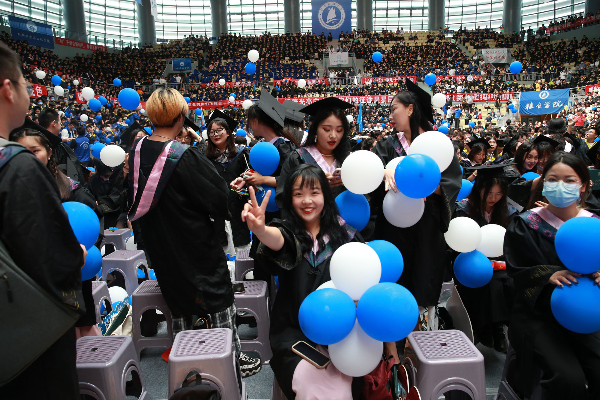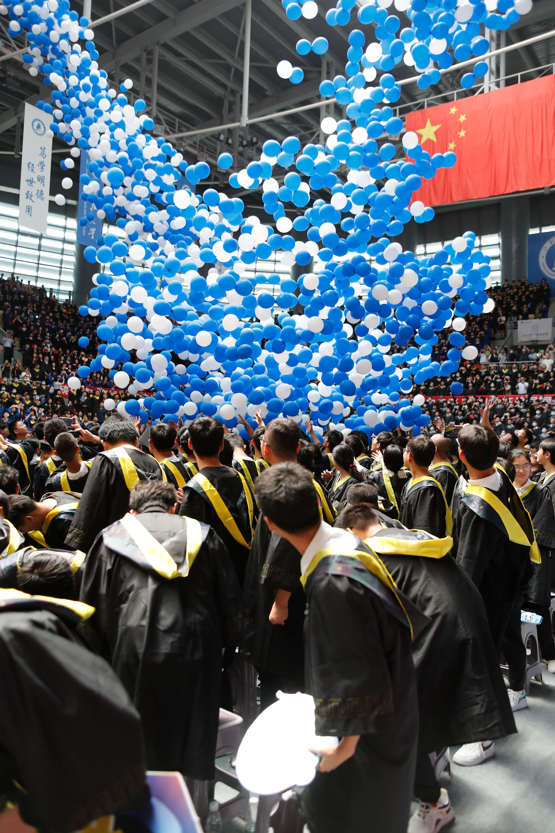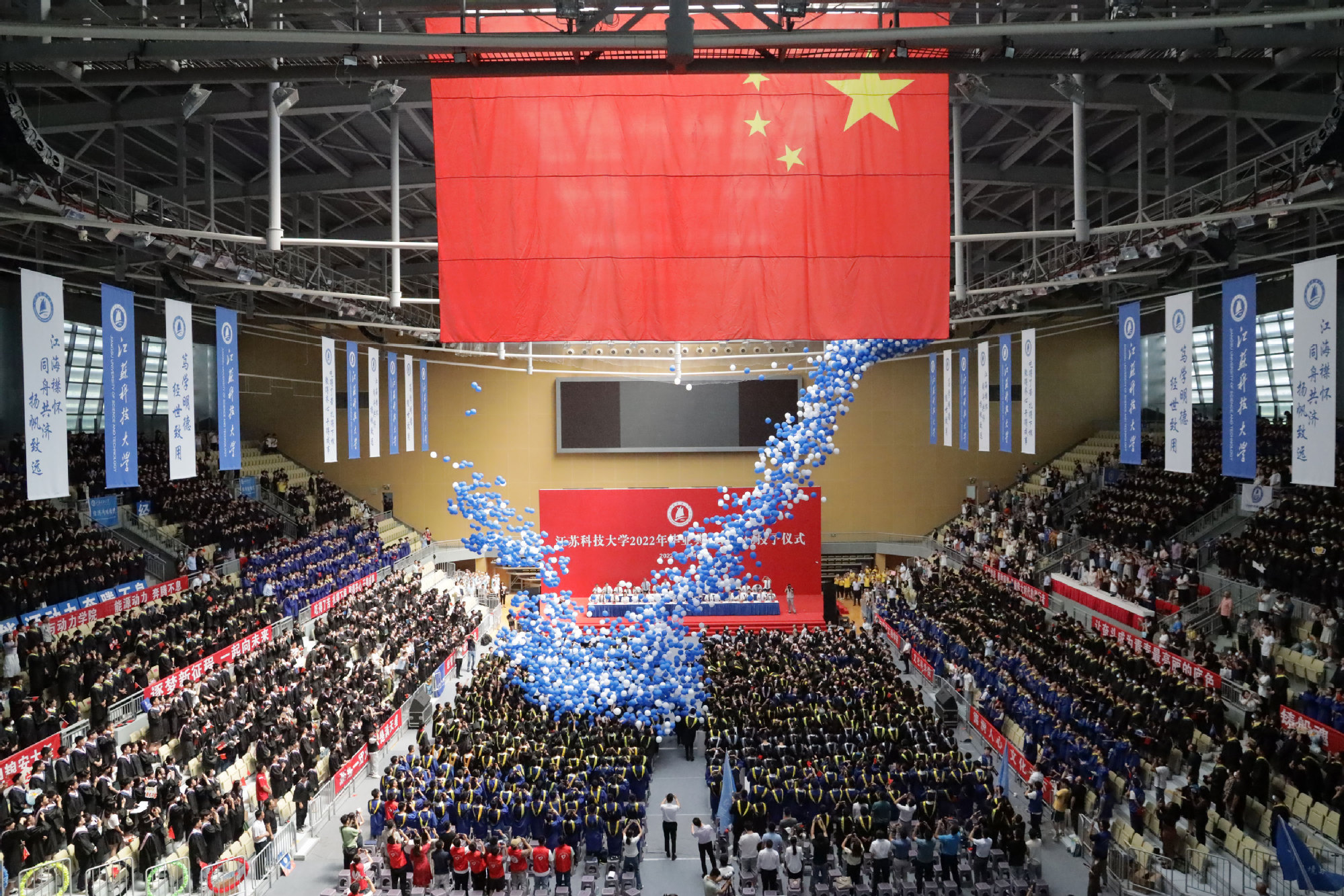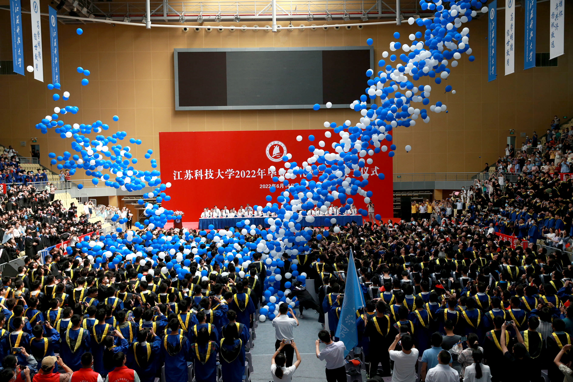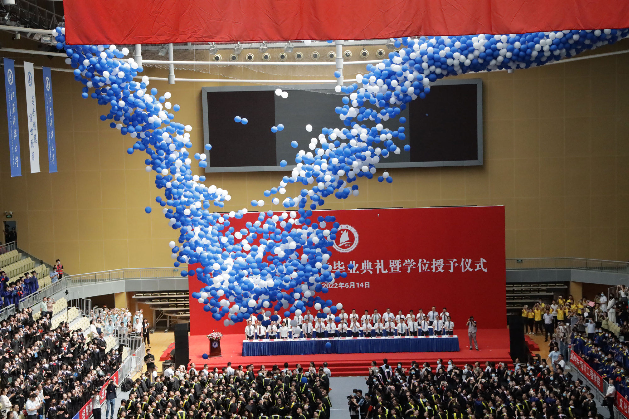 在新蒲京娱乐场官网3245校歌声中,数千只蓝白相间的彩色气球从高空缓缓散落,仿佛跃腾的海浪,将现场氛围感拉满。伴着一路欢歌,庄重的学位授予仪式开始,毕业生依次上台领取学位证书,学位委员会全体导师为他们一一拨穗,圆满完成学位授予仪式。