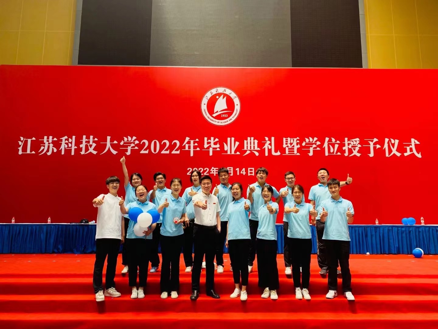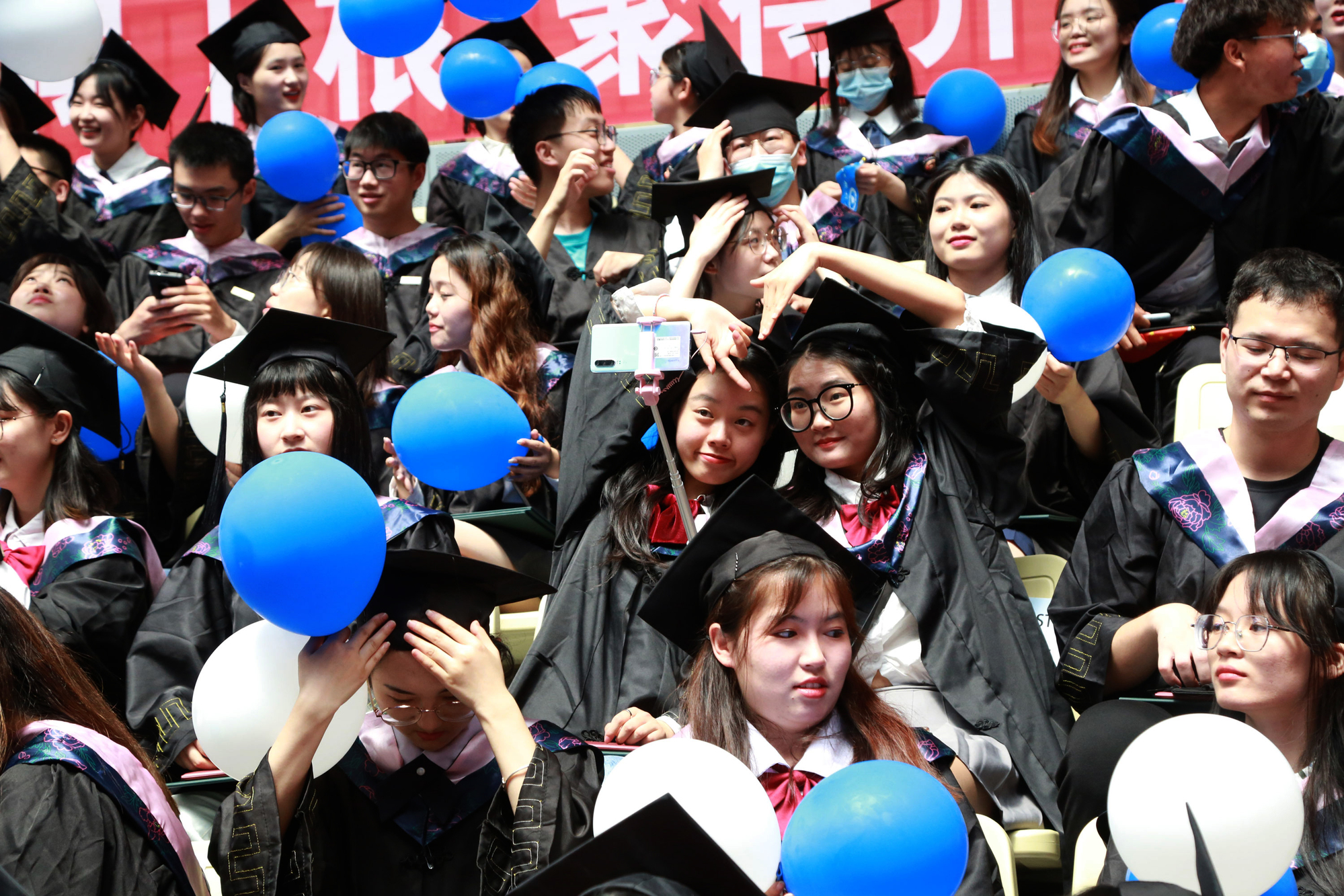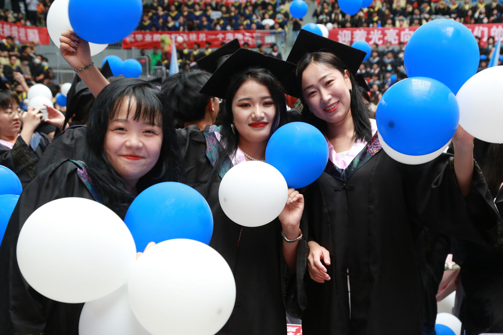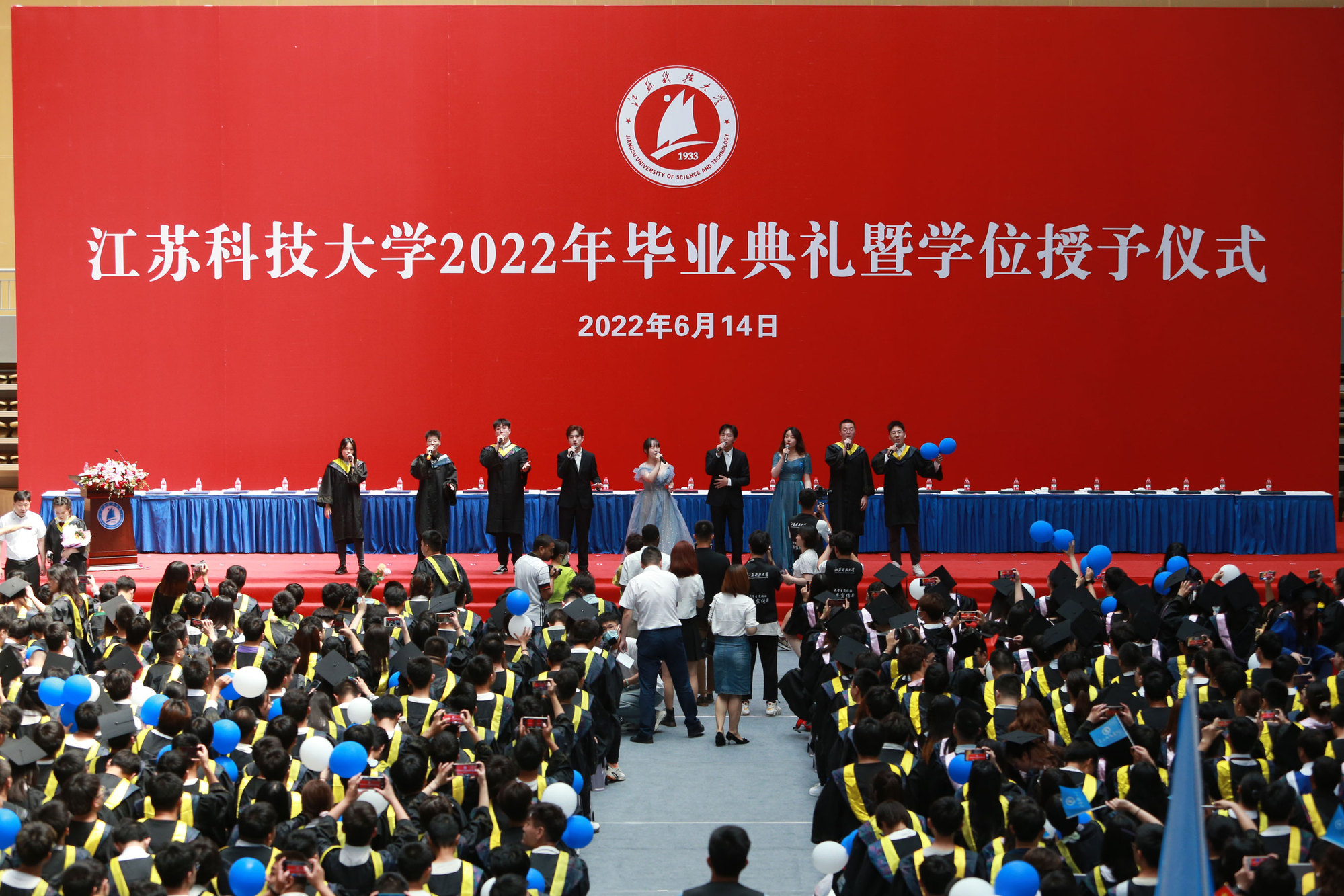 在新蒲京娱乐场官网3245校歌声中,数千只蓝白相间的彩色气球从高空缓缓散落,仿佛跃腾的海浪,将现场氛围感拉满。伴着一路欢歌,庄重的学位授予仪式开始,毕业生依次上台领取学位证书,学位委员会全体导师为他们一一拨穗,圆满完成学位授予仪式。