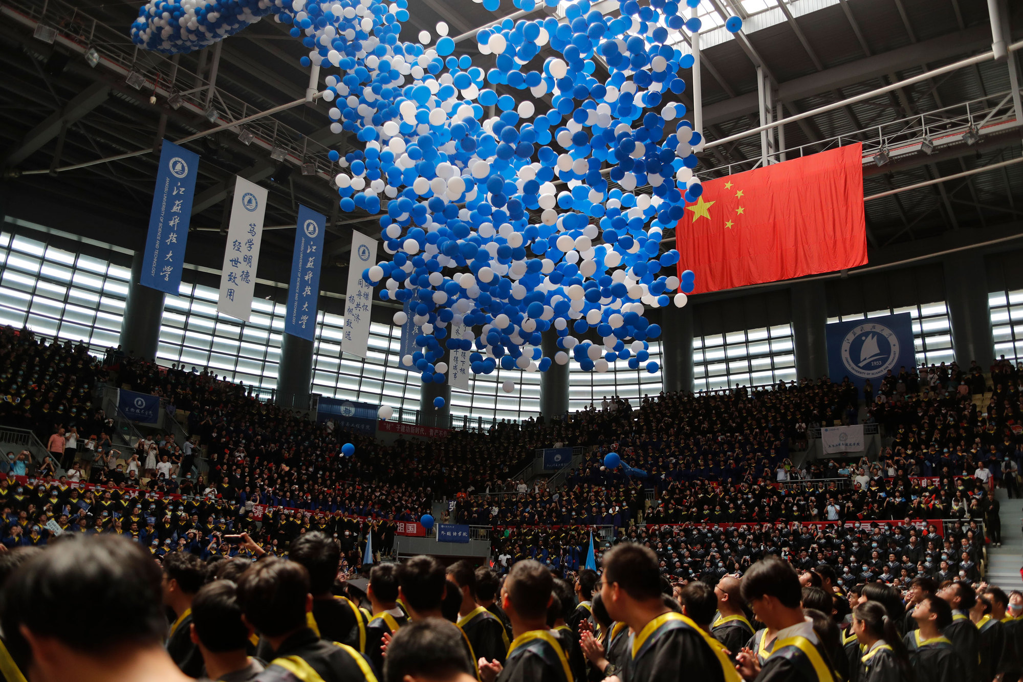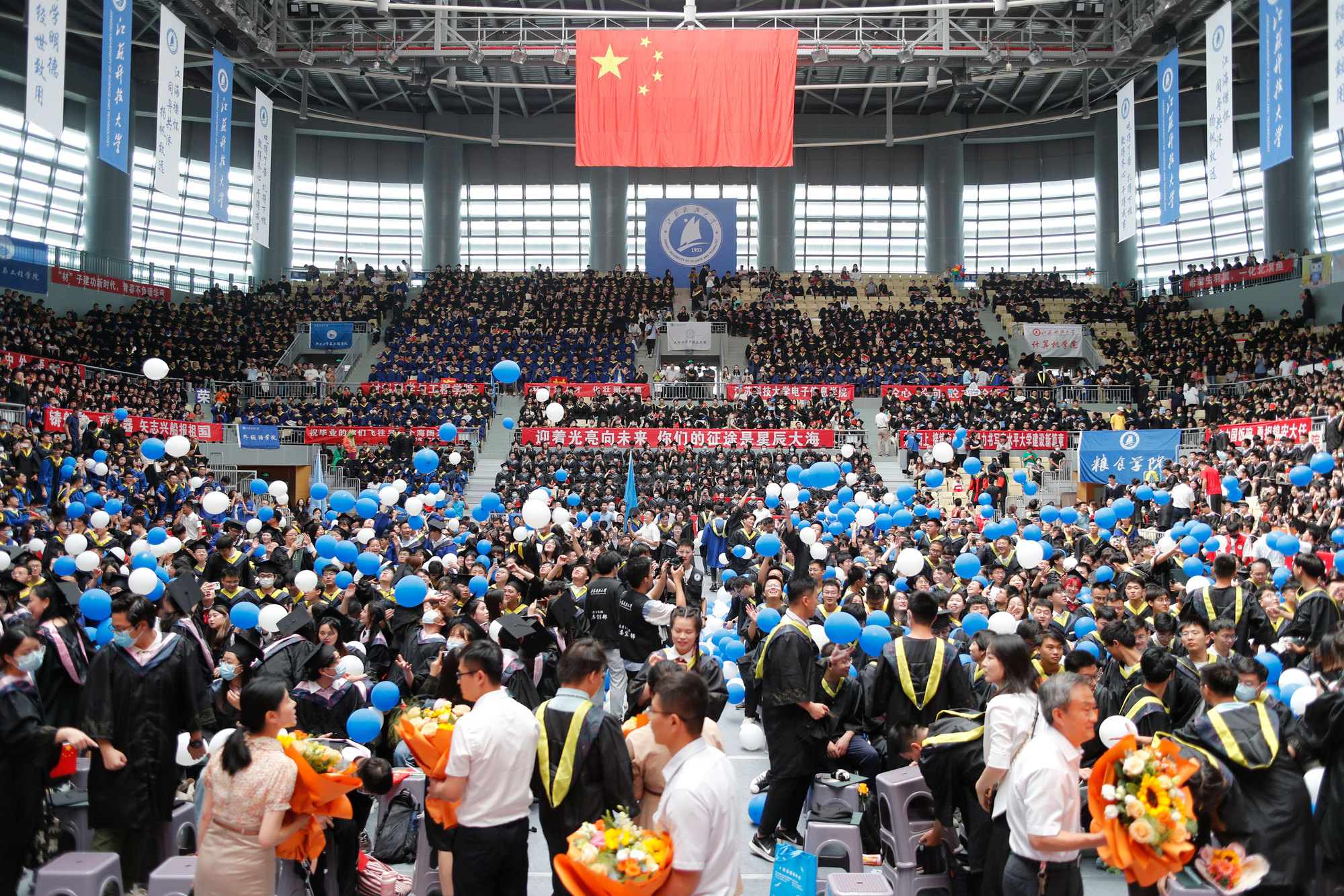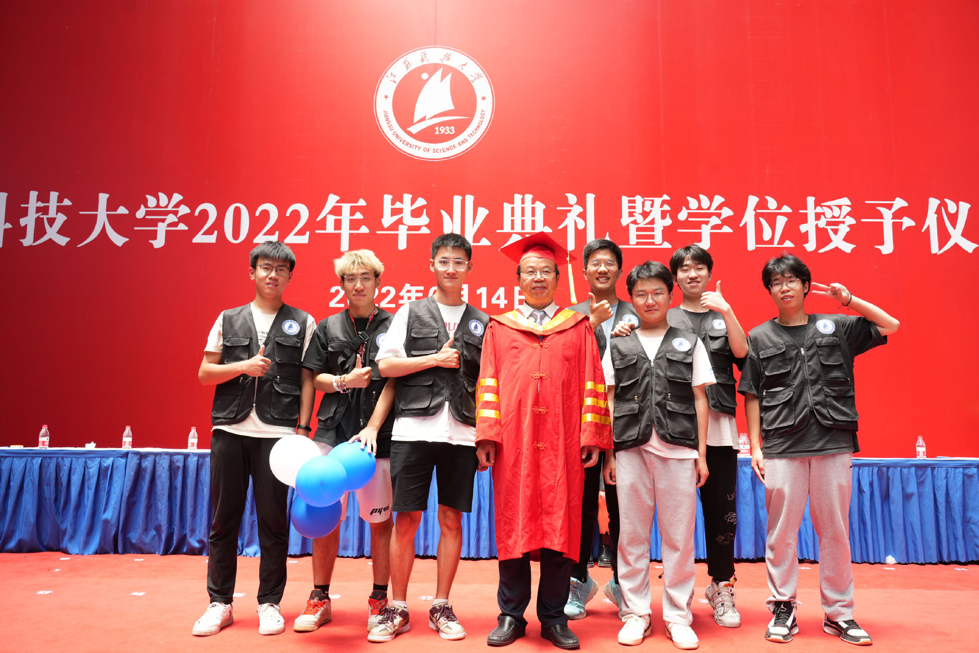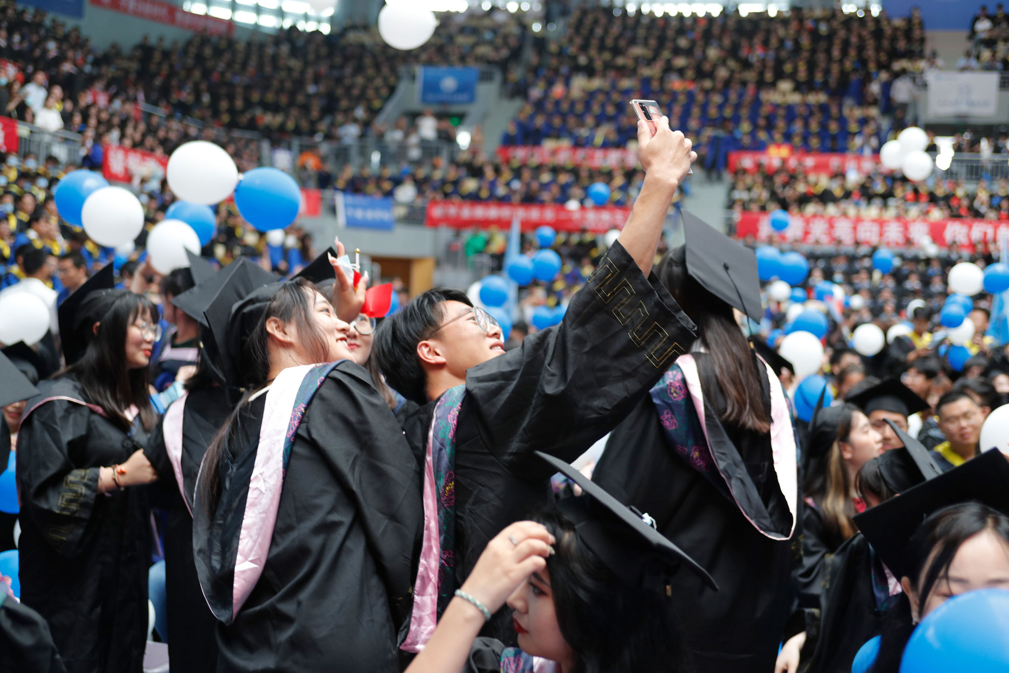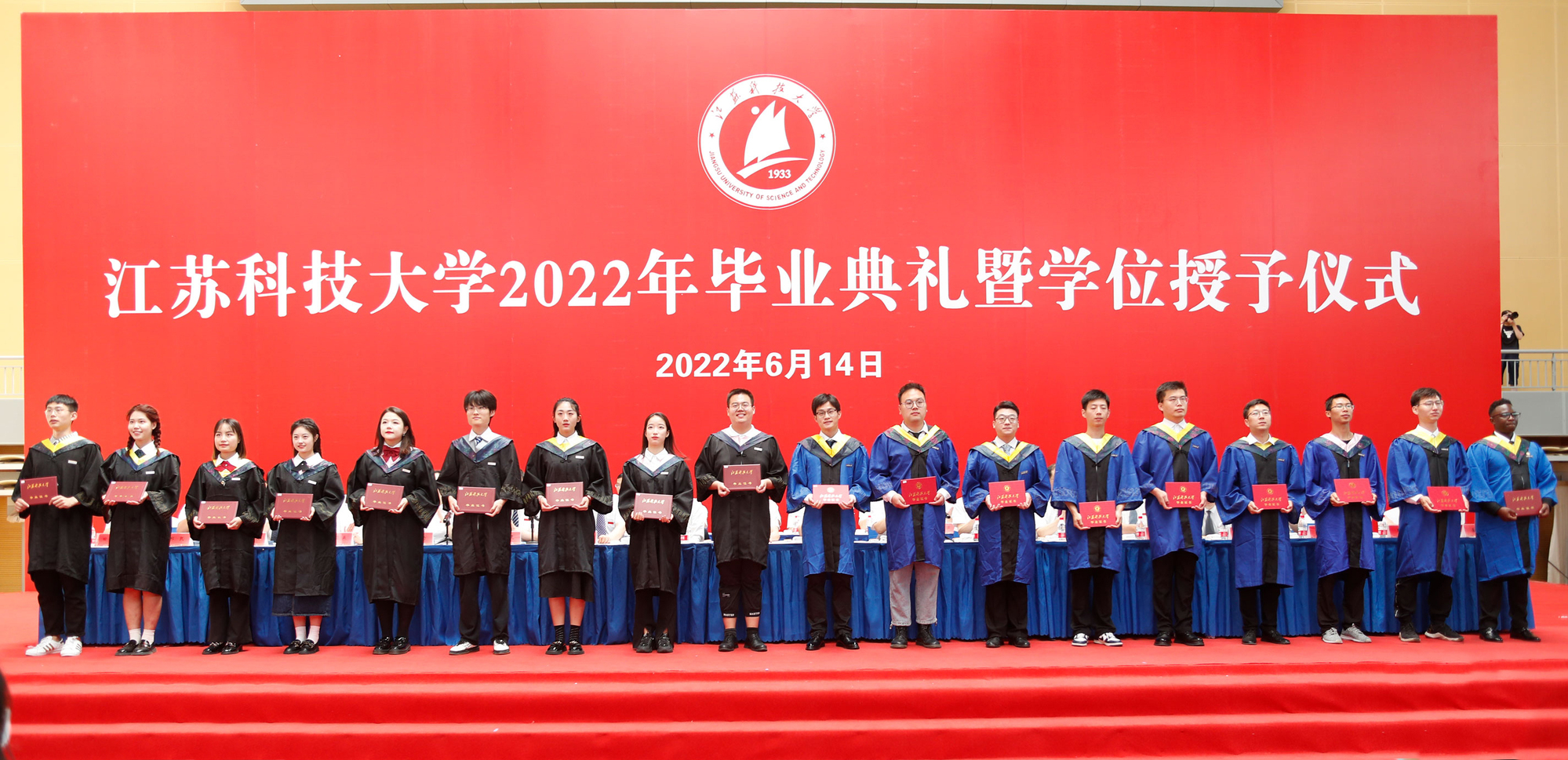 在新蒲京娱乐场官网3245校歌声中,数千只蓝白相间的彩色气球从高空缓缓散落,仿佛跃腾的海浪,将现场氛围感拉满。伴着一路欢歌,庄重的学位授予仪式开始,毕业生依次上台领取学位证书,学位委员会全体导师为他们一一拨穗,圆满完成学位授予仪式。