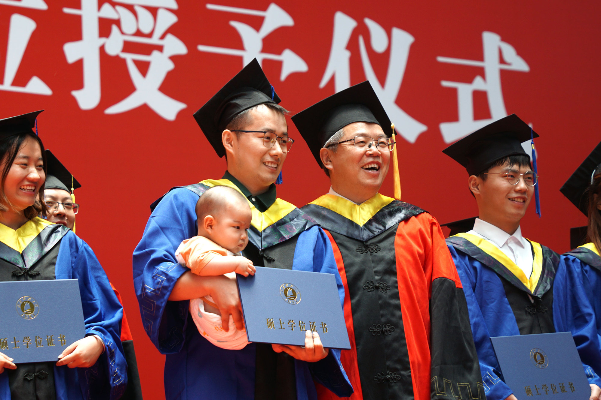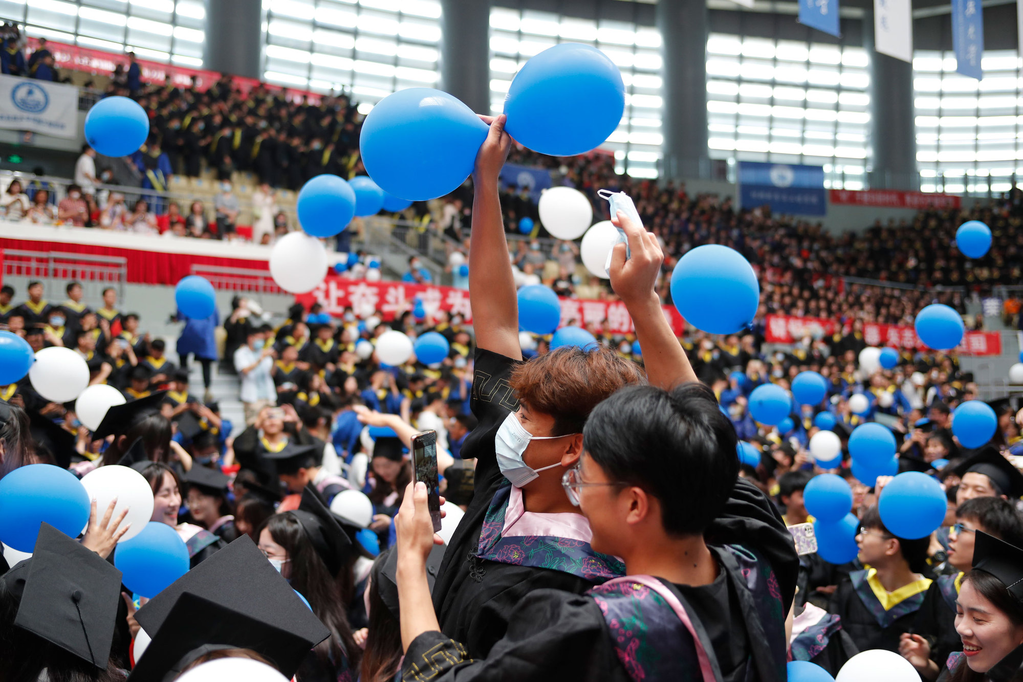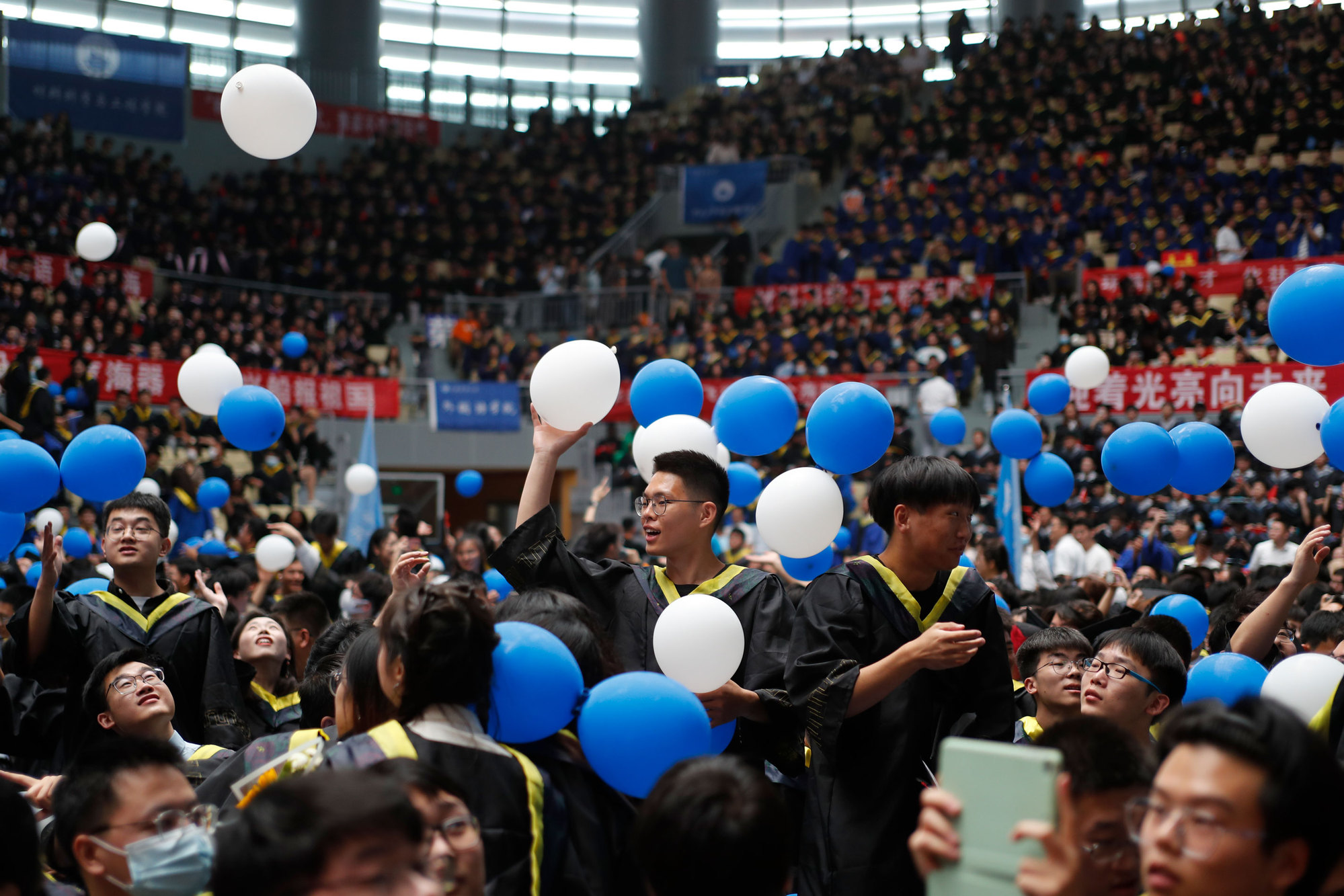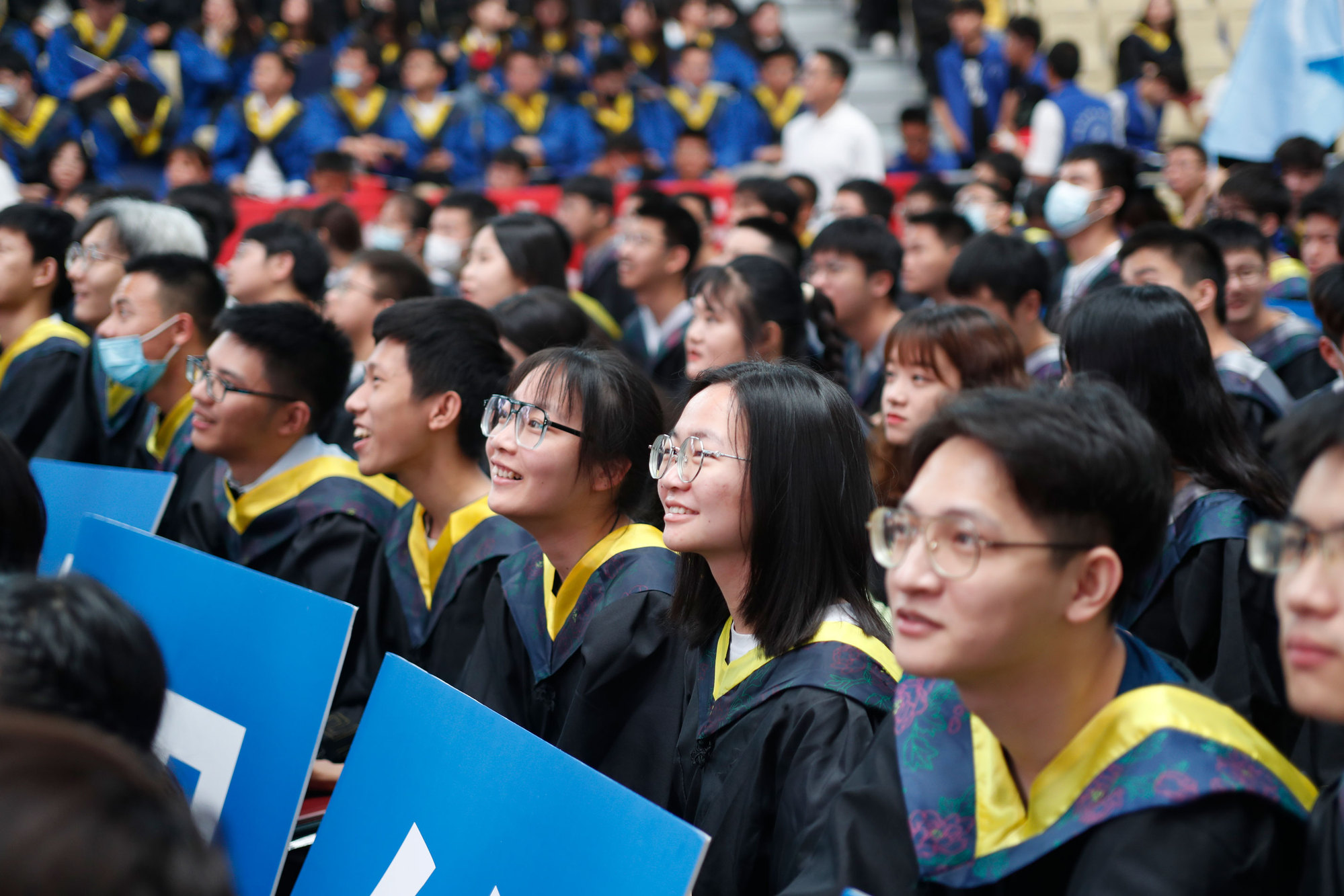 在新蒲京娱乐场官网3245校歌声中,数千只蓝白相间的彩色气球从高空缓缓散落,仿佛跃腾的海浪,将现场氛围感拉满。伴着一路欢歌,庄重的学位授予仪式开始,毕业生依次上台领取学位证书,学位委员会全体导师为他们一一拨穗,圆满完成学位授予仪式。