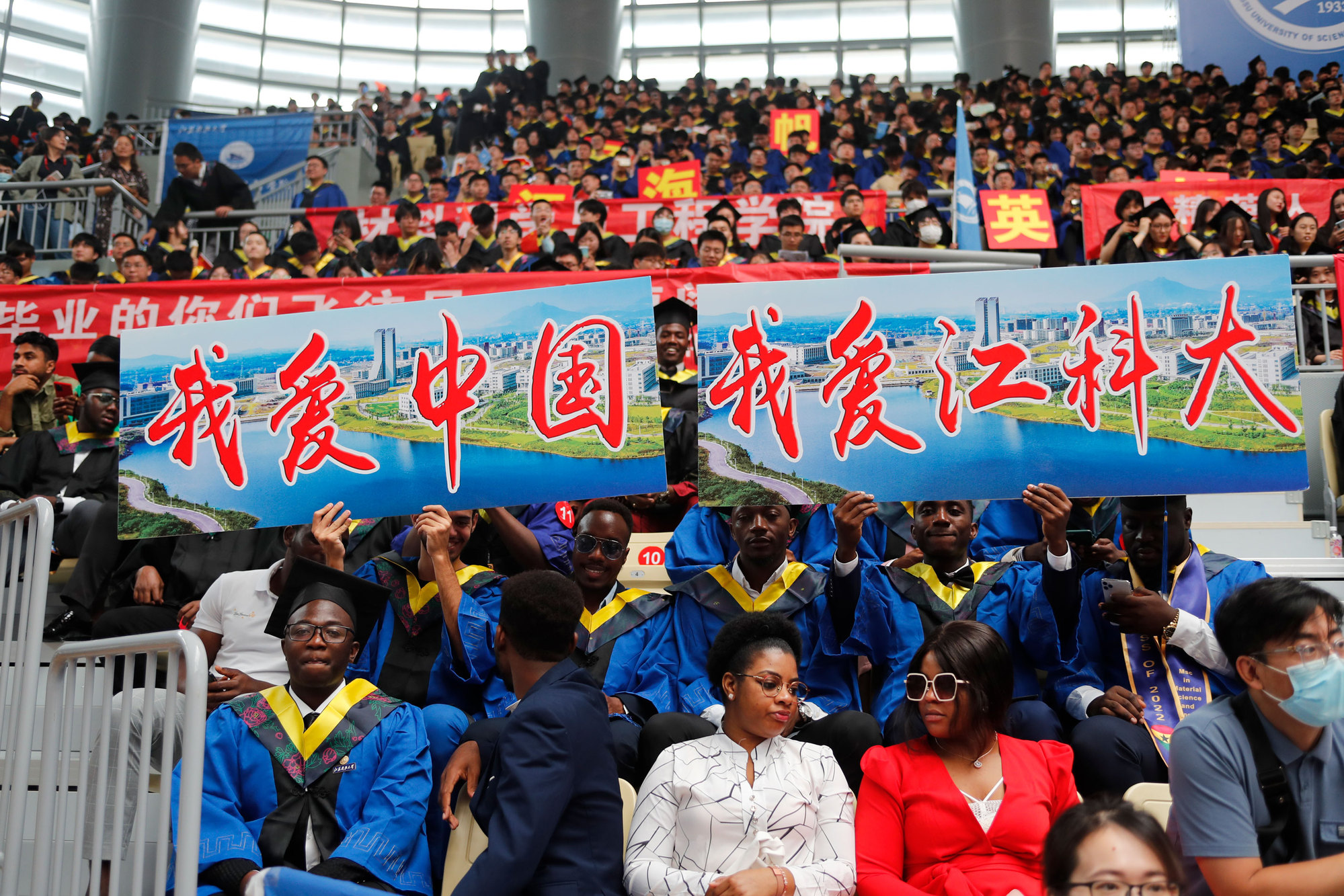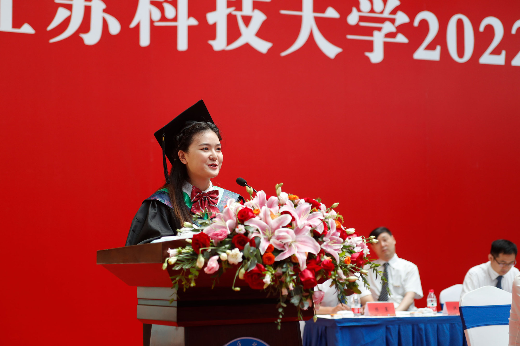 桃李感恩,心心相连。材料科学与工程学院叶飞同学代表2022届研究生毕业同学发言;来自津巴布韦的布莱特同学代表全体外国硕士留学生作毕业发言;生物技术学院庞慧琳同学作为本科生代表发言。他们与大家分享了在江科大的难忘点滴,表达了对母校的感恩和对未来的美好希冀:“长山脚下花满园,一枝一叶总关情;依依难舍别母校,筑梦青春满天星。”
