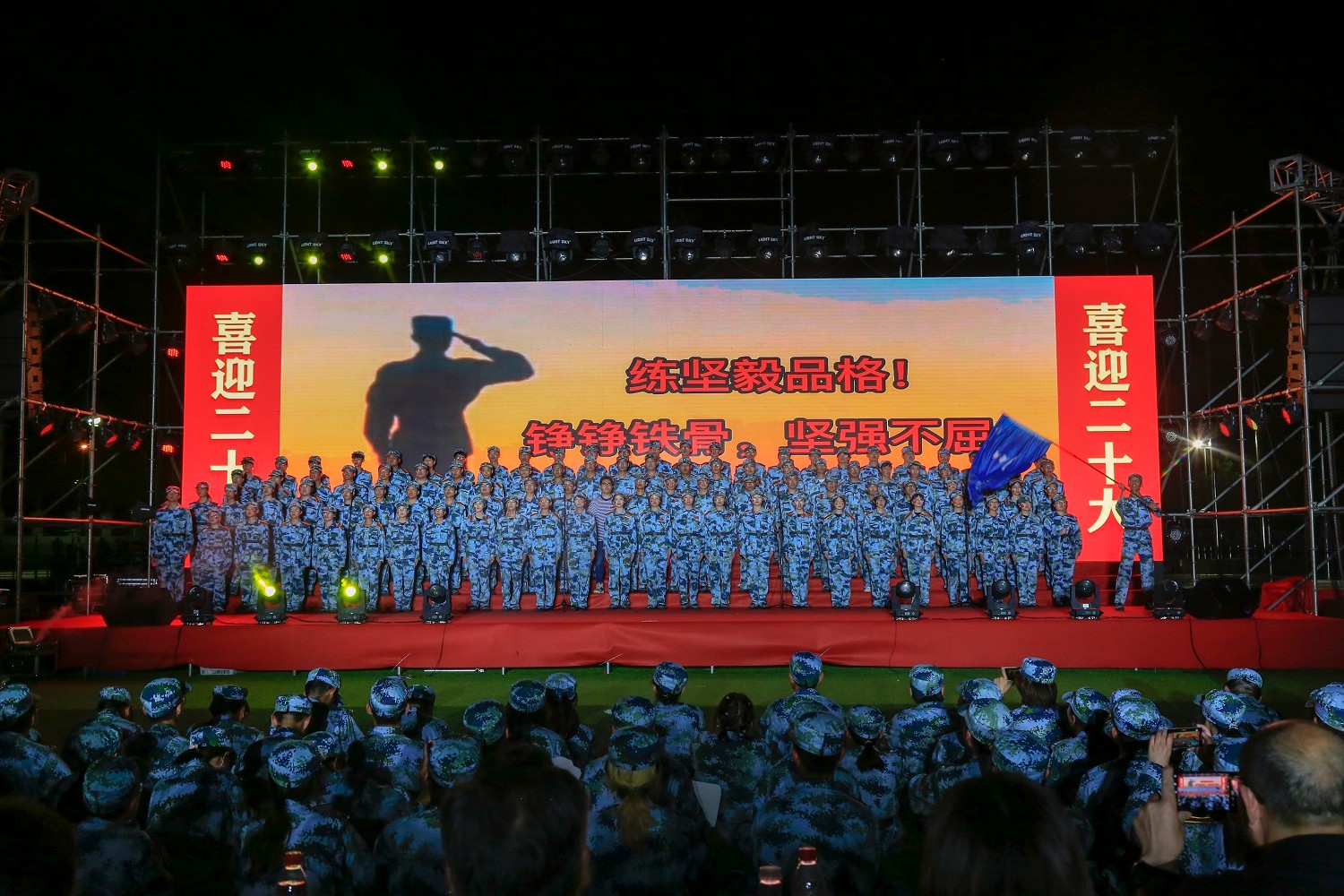 6月22日晚19点,新蒲京娱乐场官网3245梦溪校区大操场灯光闪耀,红旗迎风,一片欢腾。4700余名2021级大一同学和老师、军训教官齐聚一起,身着迷彩放声歌唱,展开一场别开生面的大合唱比赛,用青春激昂的热情、深厚澎拜的激情唱响军训主旋律,唱出对党和祖国的热爱,迎接党的二十大胜利召开。校党委副书记、副校长景旭文,党委常委、副校长任南,党委常委、宣传部部长周春燕出席了比赛,学校组织部、保卫部、团委等相关职能部门领导及各学院分管学生工作副书记来到现场观看了比赛。