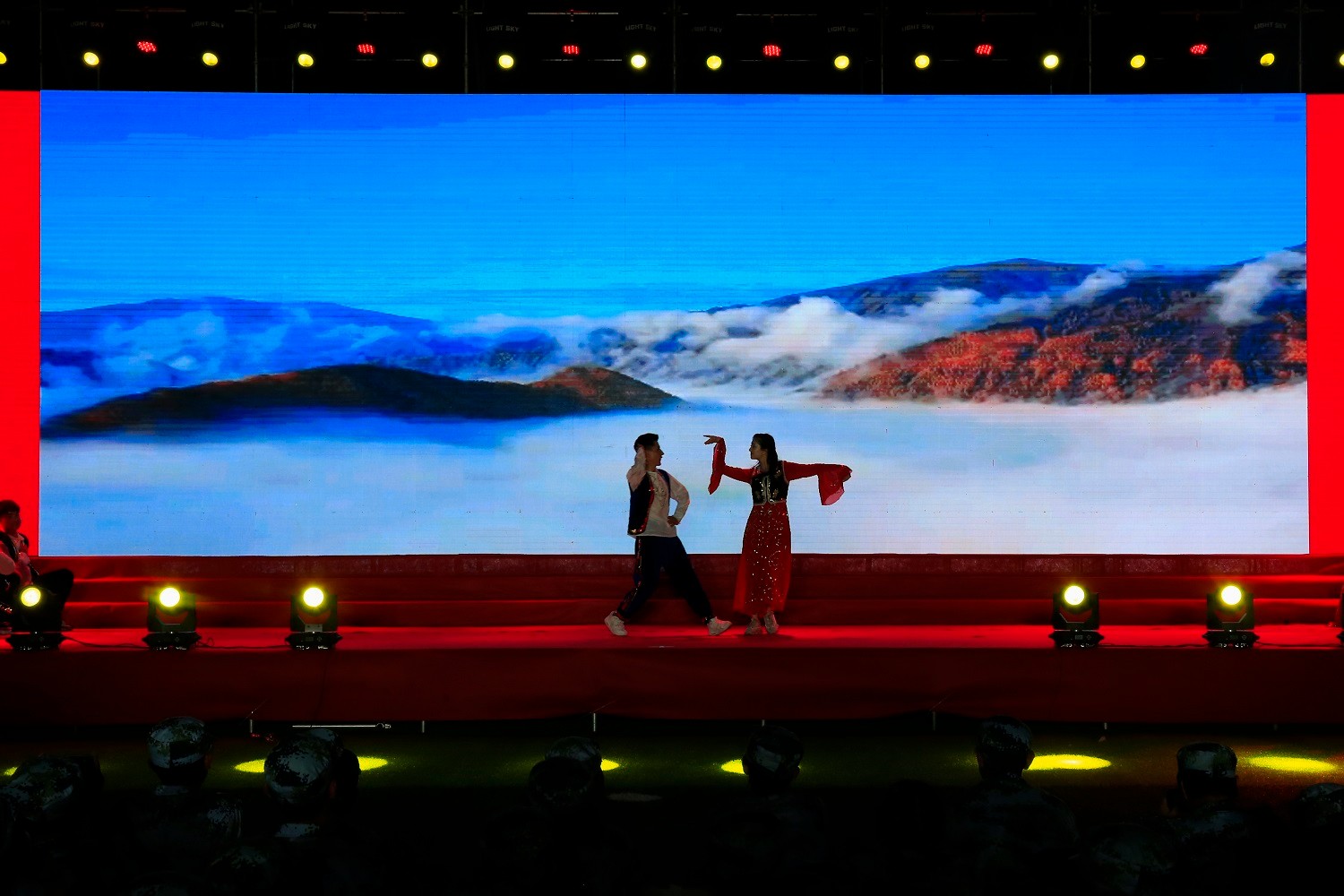 首个合唱节目是由75名来自各营的教官携手演唱。军歌唱响的那一刻,大学生教官们化身成为真正的军人,嘹亮的歌喉、饱满的士气感染了在场每一个观众,也给同学们带来了巨大惊喜。穿插于合唱比赛中的情景朗诵《我们的青年时代》,一句句铿锵的言语,一声声雄浑激昂的呐喊,饱含着对祖国的深情、对党的歌颂,红色的文字是青年人坚韧的信仰,汹涌的感慨是对党光辉历程的赞歌。精彩纷呈的表演博得了现场师生的阵阵掌声。