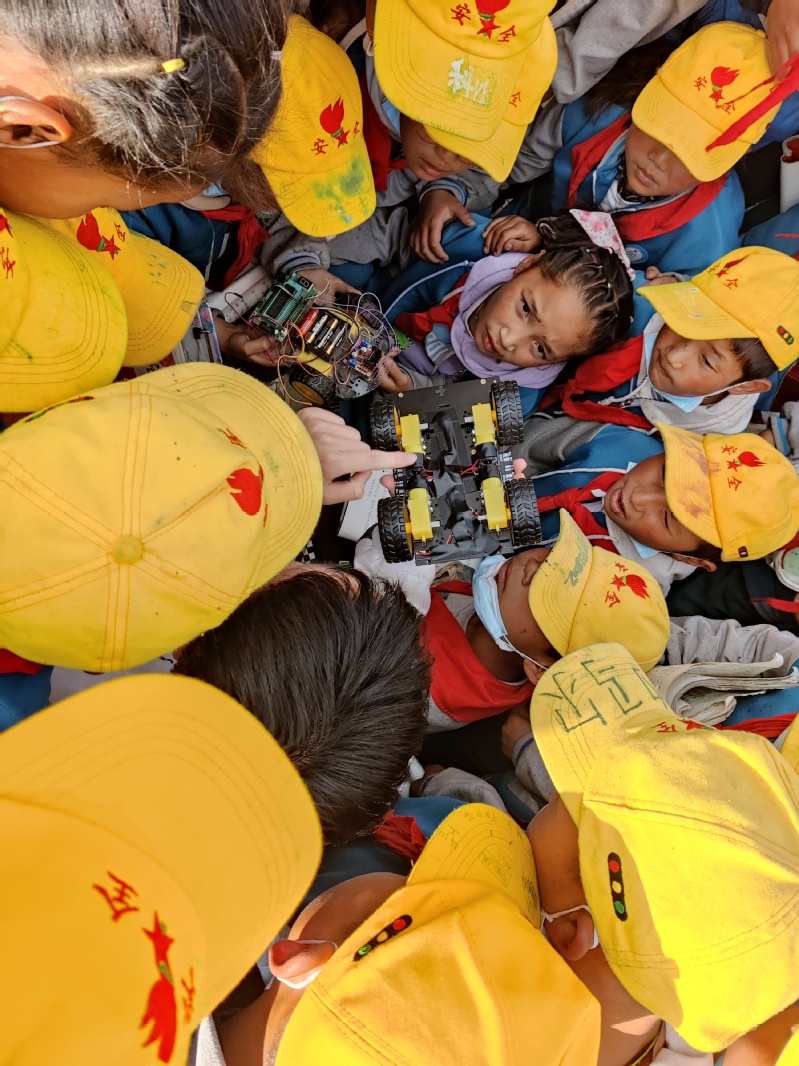“小朋友们想不想玩智能小车?”在机器人课上,支教团成员李清源展示了自己做的智能小车。他是支教团高原反应最严重的,但到了讲台上,他立即充满激情活力。“来之前我们都做了功课,经过科学调整,身体不适症状减轻了不少。”队长瞿毅坤说,他和李清源负责1-5年级14个班级的机器人课程,为了让小朋友们更真切地体验前沿科技成果,他俩一起制作了几辆智能小车并带到了拉萨,通过向同学们现场操作展示,可以让小朋友们更直观的感知人工智能,培养他们对科学技术的兴趣和爱好。