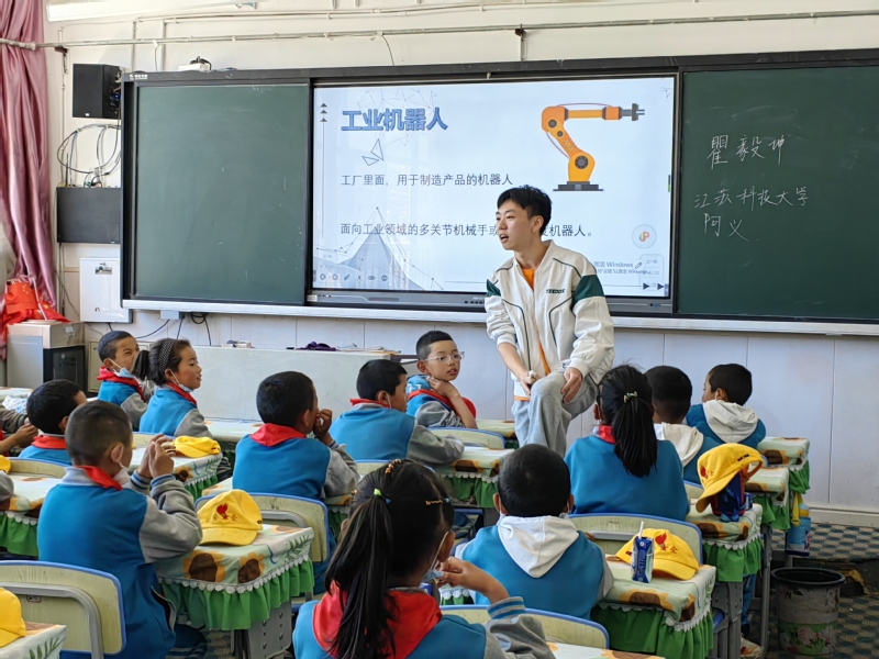 在另一间教室里,朱珊正在给孩子们分享自己的专业知识和成长故事,鼓励他们发奋学习,积极探索数学世界的奥秘。这个有点腼腆的女孩,来自河南一个偏远山村,在国家资助下,通过自己的努力考上大学、走出大山,孩子们对她的拼搏精神投出了钦佩的目光。来自外国语学院的崔永权是个文学爱好者,他通过绘声绘色朗诵诗文作品,在孩子们心中种下了一颗文学的种子。与此同时,支教团为西藏小朋友们量身定制的写作、机器人、英语、计算机等课程全面展开,给小朋友们带去了别开生面的第二课堂体验。