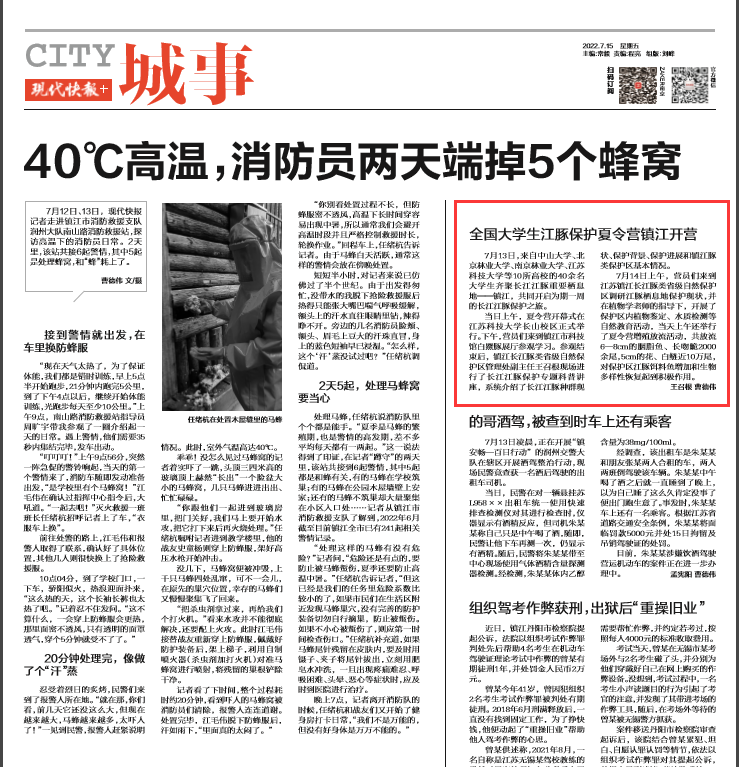 7月13日,来自中山大学、北京林业大学、南京林业大学、新蒲京娱乐场官网3245等10所高校的40余名大学生齐聚长江江豚重要栖息地——镇江,共同开启为期一周的长江江豚保护之旅。