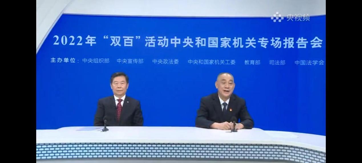 7月22日,2022年“百名法学家百场报告会”法治宣讲活动中央和国家机关专场报告会以网络直播形式举办。新蒲京官网组织党员干部、教师、学生等通过“央视频”APP收看了专场报告会直播。据悉,今年“双百”活动的主题为“深入学习宣传贯彻习近平法治思想”。