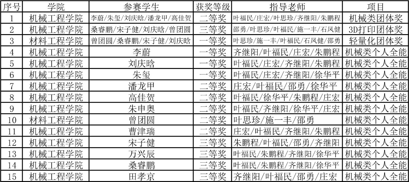 学校高度重视本届大赛,参赛项目在教务处指导、机械学院领导的关心下,经过学校初赛,江苏省预赛,最终有13名同学进入全国决赛阶段的比赛。参赛同学在指导老师的带领下,克服疫情影响积极备赛,有针对性地完成机械类各项目的训练,多次线上模拟发现问题及时解决问题,最终在决赛中,机械工程学院朱玺和刘庆晗同学(指导老师:叶福民等)、李蔚同学(指导老师:齐继阳等)获得机械类个人全能一等奖,且全队获得机械类团体二等奖(指导老师:叶福民等)。材料科学与工程学院的曾团圆等同学获得轻量化设计项目的一等奖(指导老师:叶思珍等),桑睿鹏等同学获得 3D打印项目的三等奖(指导老师:邵勇等),另外机械工程学院的潘龙甲、高佳贺、朱申奥、曹津瑞同学获得个机械人全能二等奖,宋子健、万兴辰、桑睿鹏、田孝京同学获得机械个人全能三等奖的优异成绩。
