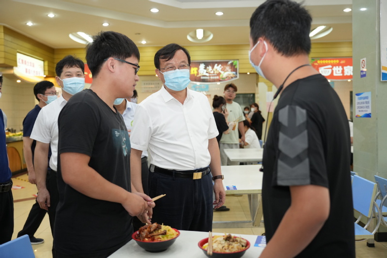 在梦溪校区学生宿舍,周南平校长询问来自四川南充的2022级机械专业的刘竞成同学何时抵达镇江、对饮食和住宿是否习惯、宿舍用品和军训服装的准备情况等,鼓励他努力学习、认真钻研,祝愿他学有所得、学有所成。在梦溪校区学生餐厅,周南平校长询问来自贵州的韦凯和来自重庆的向辰一同学对食堂饭菜的口味感觉如何、对餐厅价格感受如何,认真听取他们的建议,鼓励他们初来异地会有一个适应的过程,现在宿舍是小家,学校是大家,只要多沟通、多交流,一起努力,小家和大家都会被建设得越来越好。在长山校区新生入校点,周南平校长请专程从盐城开车送孩子来校报到的新生家长放心,“有问题问老师,有困难找学校,来了江科大,请您一定放心!”