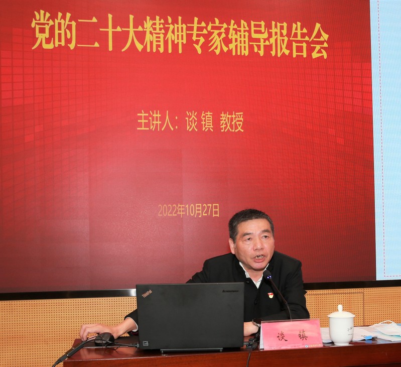 谈镇以《夺取习近平新时代中国特色社会主义思想新胜利的政治宣言和行动纲领》为题,简明阐述了大会的背景、主题、意义,详细梳理党的二十大报告结构布局,深入解读党的二十大报告内容要点。他强调,报告深刻阐释了新时代坚持和发展中国特色社会主义的一系列重大理论和实践问题,描绘了全面建设社会主义现代化国家、全面推进中华民族伟大复兴的宏伟蓝图,为新时代新征程党和国家事业发展、实现第二个百年奋斗目标指明了前进方向、确立了行动指南。