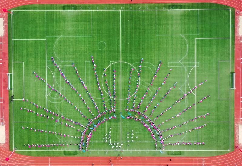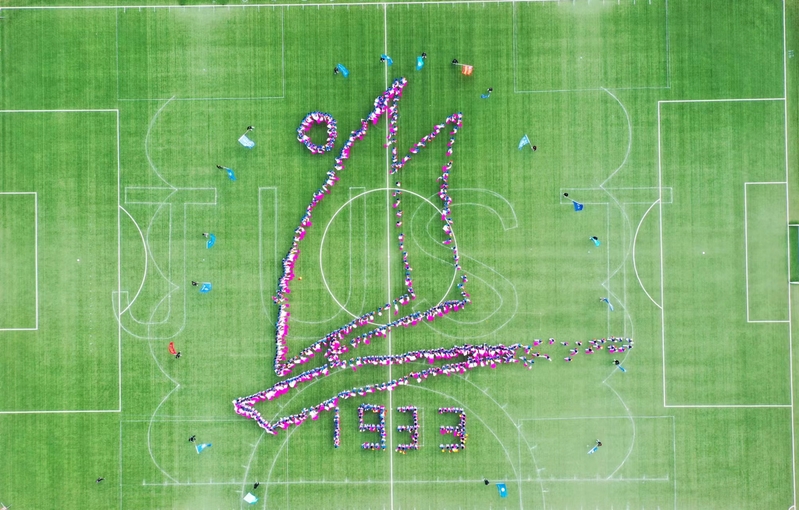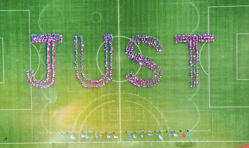 团体操表演以“庆贺党的二十大,传承冬奥精神”为主题,凝聚了主创教师团队及500余名学生的近2个月辛勤付出,青春洋溢、场面震撼。篇章一“奋进新时代,一起向未来”,绿茵场上,两个米字轮轴不停转动,象征着晶莹雪花与生命花束美丽绽放,契合了北京冬奥会“一起向未来”的主题口号;篇章二“青春舞飞扬,全民共健康”,同学们手中彩扇随风飘扬,灵活的舞姿书写运动青春,为全民健康贡献力量;篇章三“共筑船魂梦,强国必有我”,金色的太阳散发出一道道光芒,他们用飞扬的青春礼赞美好生活, “J”“U”“S”“T”和新蒲京娱乐场官网3245校徽相继展现,鲜艳的长扇和彩旗不断舞动,表达了对学校航向未来和党的二十大胜利召开最真诚的献礼和祝福。