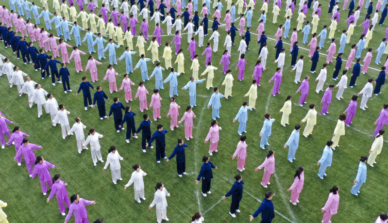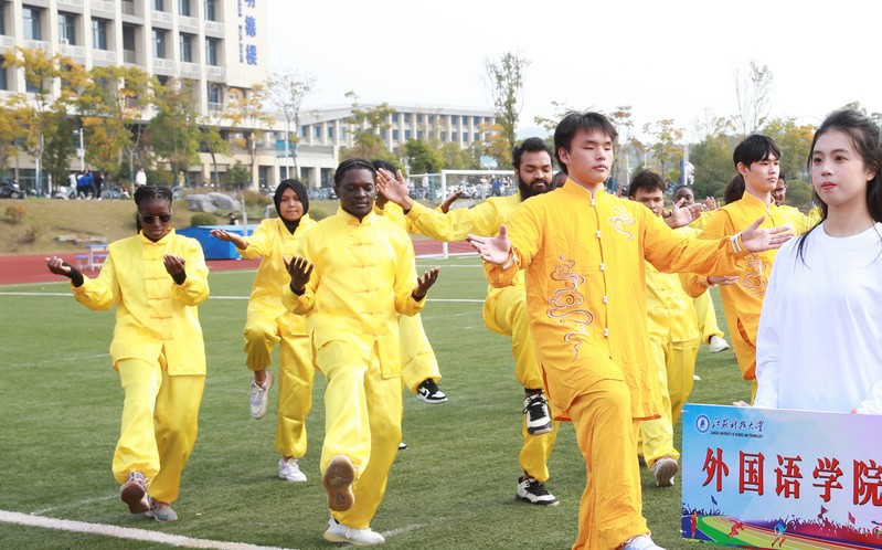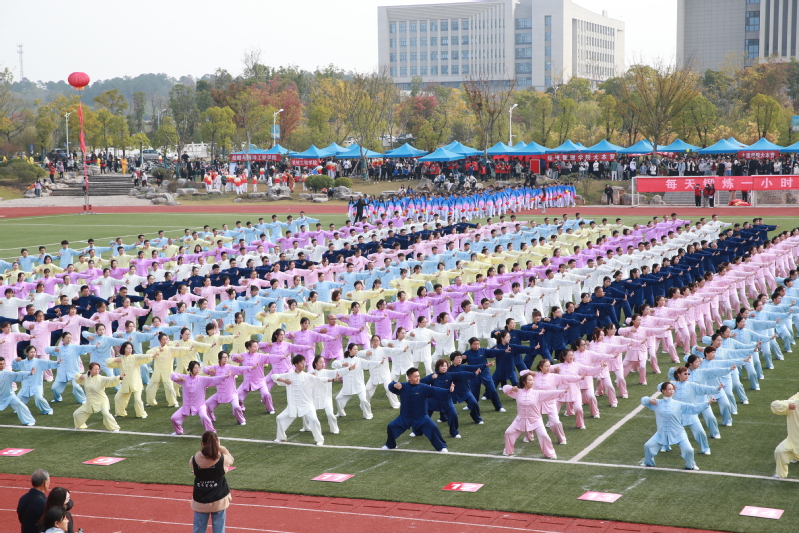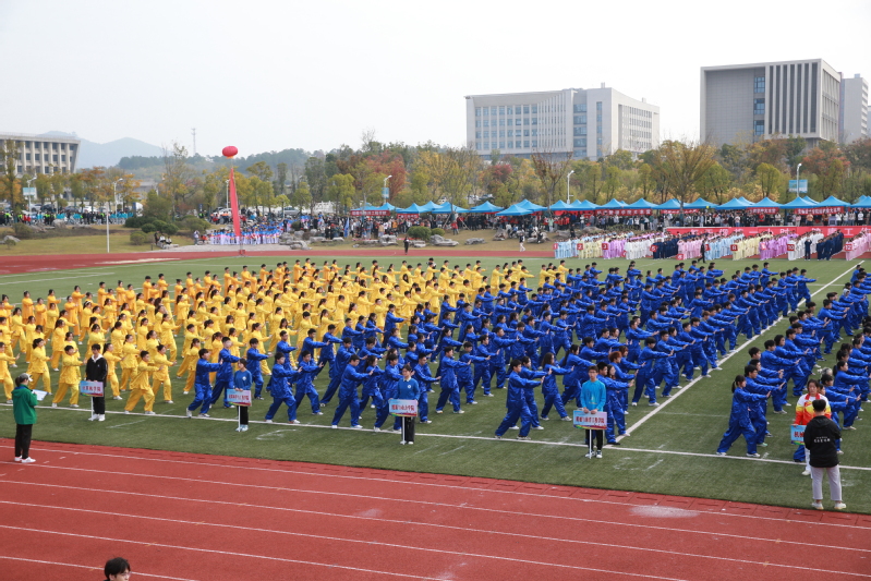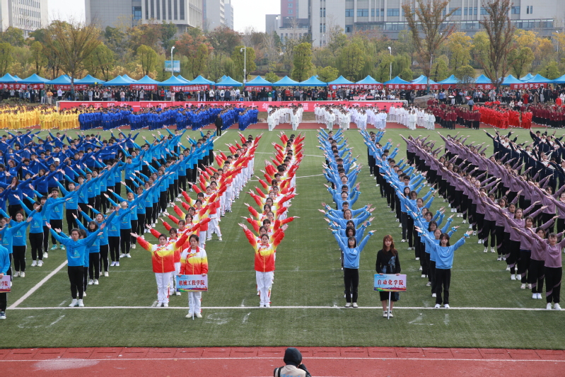 伴着热烈的掌声与欢呼声,精彩的体育表演开始。各学院整齐划一地展示广播操和太极拳训练成果,一招一式无不彰显新蒲京娱乐场官网3245“一操、一拳、一泳”的公共体育教学特色。“乐运动、全民享、共筑科大梦”,由新蒲京官网800余名教职工组成的团队为大家奉献了精彩的八段锦表演,运动员们气定神闲地舒展肢体,动作舒缓、流畅,传达了快乐工作、幸福生活的理念。