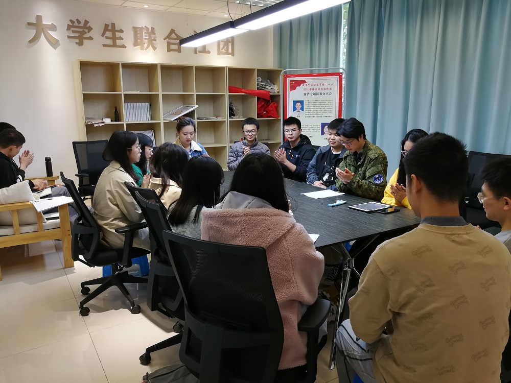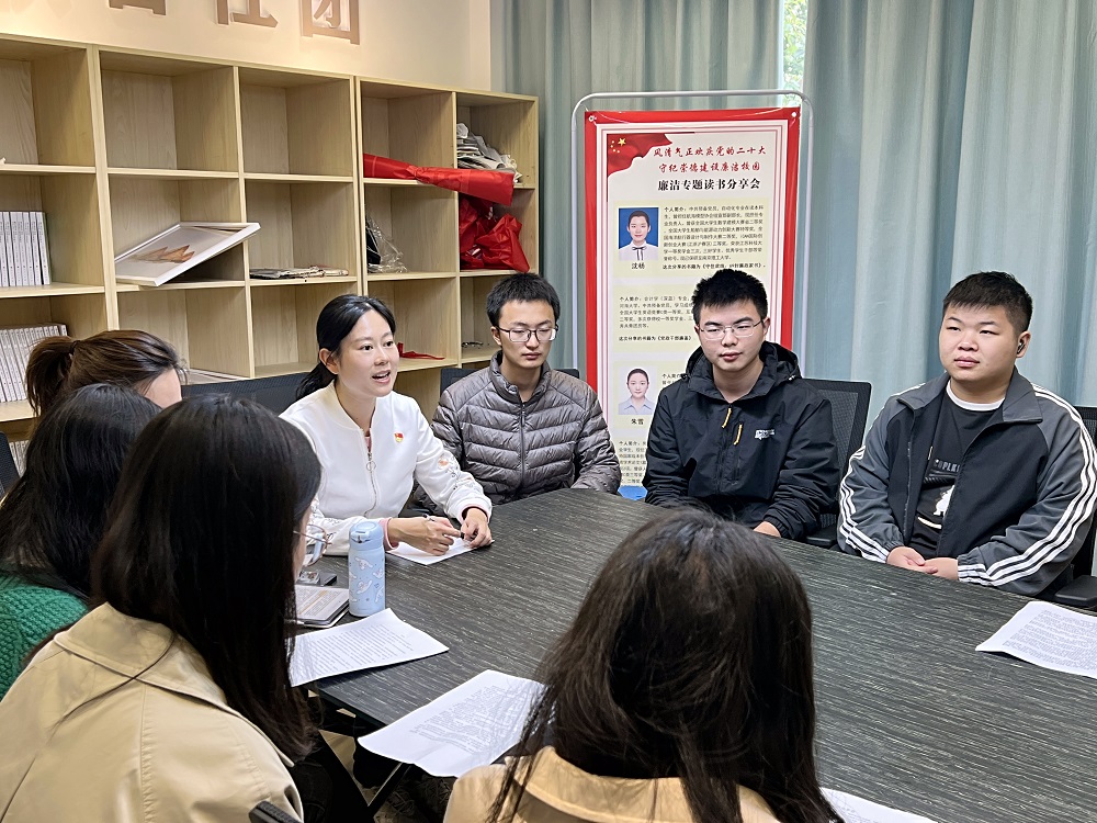 10月28日下午,长山校区2号组团社团空间传来清朗的读书声,10余名师生党员、2019级深蓝学子围坐在一起,以“风清气正 守纪崇德建设廉洁校园”为主题进行廉洁读书交流分享读书会。