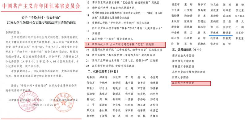 近日,“手绘乡村·青春行动”江苏大学生暑期社会实践专项活动评审结果公布,新蒲京官网土木工程与建筑学院任鹏远老师指导的土木工程与建筑学院“筑艺”实践团项目获优秀团队B等,建筑学专业2020级郭琳琳、杨忻睿同学获评“优秀志愿者”称号,新蒲京娱乐场官网3245团委获优秀组织奖。这是新蒲京官网首次获得该实践专项优秀团队奖、优秀志愿者、优秀组织奖。