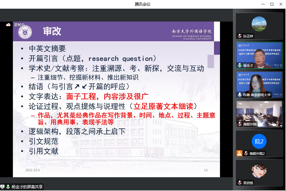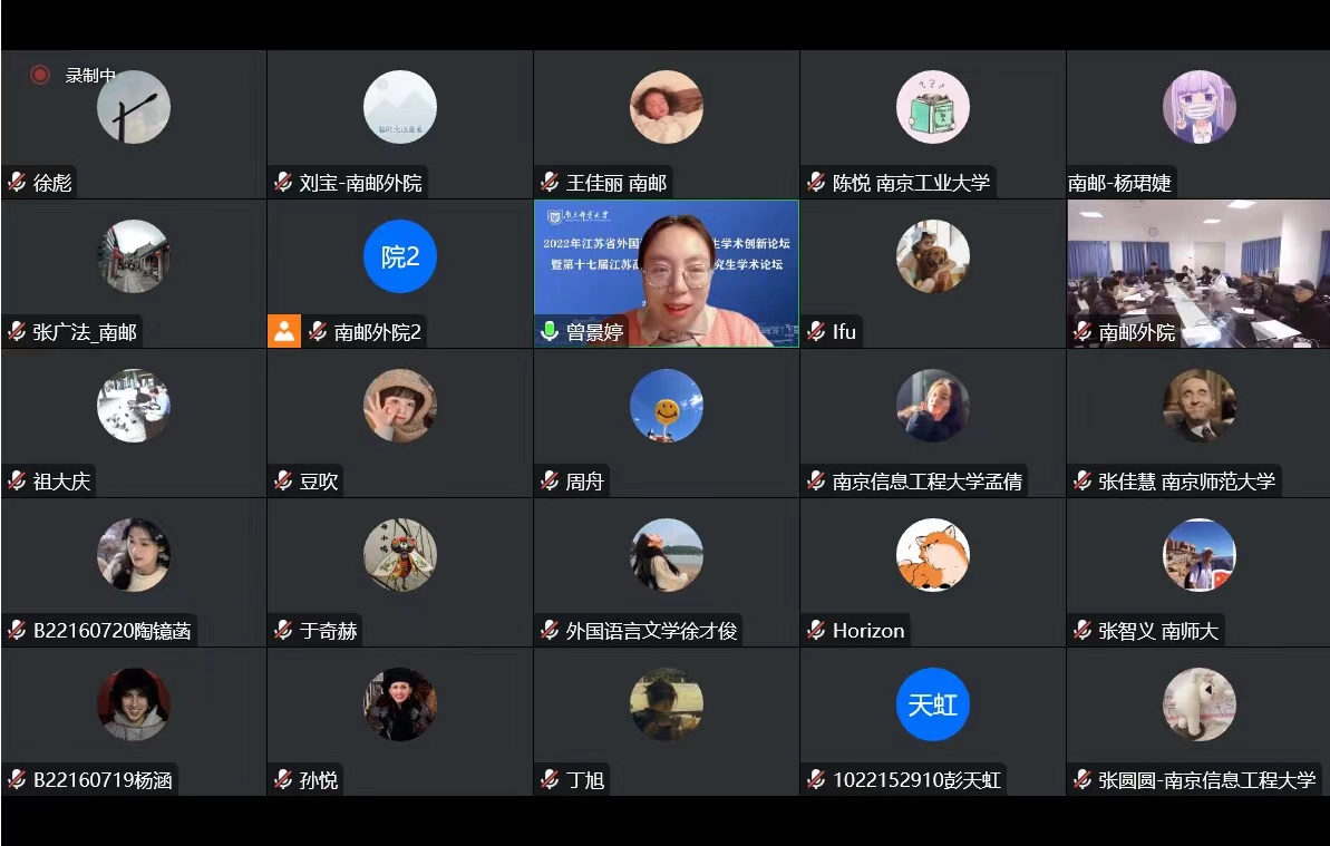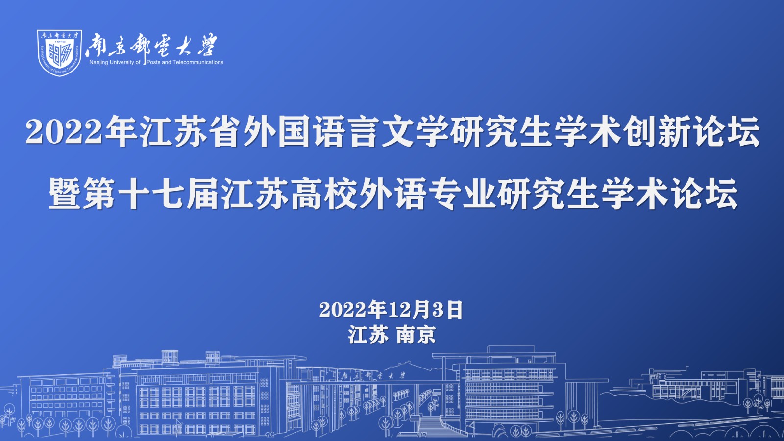 日前,江苏省外国语言文学研究生学术创新论坛暨第十七届江苏高校外语专业研究生学术论坛在南京邮电大学外国语学院成功举办。本次论坛由江苏省文学类研究生教育指导委员会、江苏省高等学校外国语教学研究会、江苏省高校外语专业研究生学术论坛组委会主办。论坛以“新文科·大外语”为主题,采用线上线下结合的方式,吸引了来自江苏省各高校的200余名专家学者、硕博研究生参加。我院共有6名研究生的论文获选,应邀参加本次论坛并作发言,学院组织全体研究生线上参会。