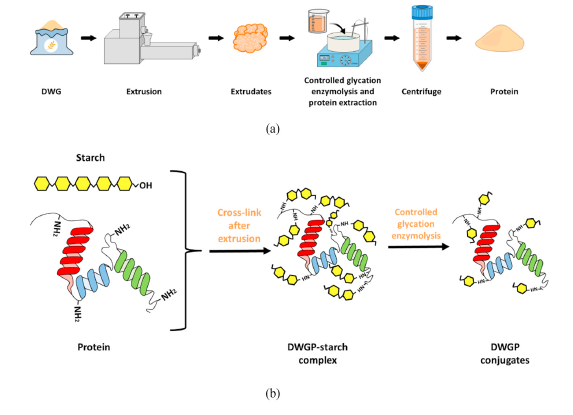 高乳化性蛋白配料可广泛应用于饮料、乳制品、巧克力、冰激凌等乳化型制品中,是一类用量大、需求多的高附加值食品配料。食品工业用作乳化剂的蛋白质主要来自牛奶、大豆、鸡蛋等,但它们都含有常见的食物过敏原。麦胚蛋白因其低致敏性和低成本而被认为是上述蛋白质的良好替代品。然而麦胚蛋白乳化性和乳化稳定性不高,对其进行改性处理来改善乳化性能。该论文先利用挤压膨化技术处理麦胚粉以促使淀粉与蛋白交联,再用可控酶解技术制备麦胚蛋白,然后对麦胚蛋白的理化特性和功能特性进行了研究。结果表明,挤压膨化处理和可控酶解使麦胚蛋白分子上偶联了适量糖分子,改善了蛋白分子的疏水基团与亲水基团比例,有利于水包油(O/W)乳化体系的形成,表现出了良好的稳定性。该研究成果已申报了国家发明专利。