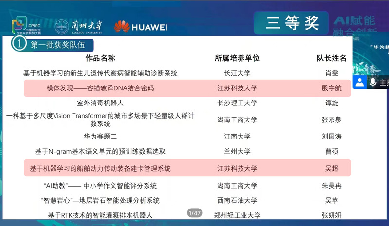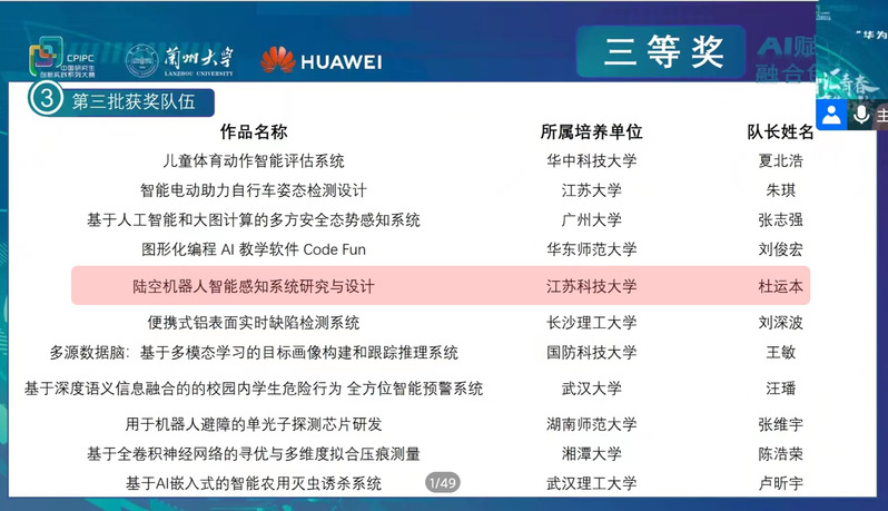 12月10日,由教育部学位管理与研究生教育司指导,中国学位与研究生教育学会、中国科协青少年科技中心主办,兰州大学承办的“华为杯”第四届中国研究生人工智能创新大赛全国决赛在甘肃兰州举办。经过激烈角逐,新蒲京官网学子获国家级奖项3项,实现历史性突破。获奖项目分别是:由教师高尚指导、殷宇航等完成的《模体发现——容错破译DNA结合密码》,由教师李炳强、刘金锋指导,吴超等完成《基于机器学习的船舶动力传动装备建卡管理系统》,由教师仲伟波、於跃成指导,杜运本等完成的《陆空机器人智能感知系统研究与设计》。